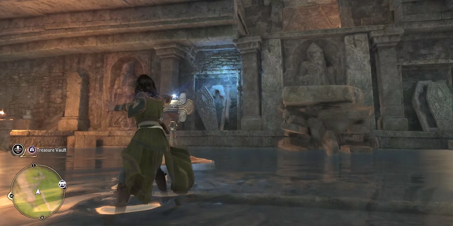Последнее хранилище находится рядом с предыдущим, поэтому можно продолжать идти на юго-запад, чтобы найти хранилище сокровищ у основания горы. Чтобы найти заколдованный куб, идите на юго-восток и увидите пару браконьеров. Победите врагов и поднимите крышку гроба, чтобы освободить заколдованный куб. Направьте его обратно ко входу и используйте Glacius в Hogwarts Legacy, чтобы открыть хранилище.