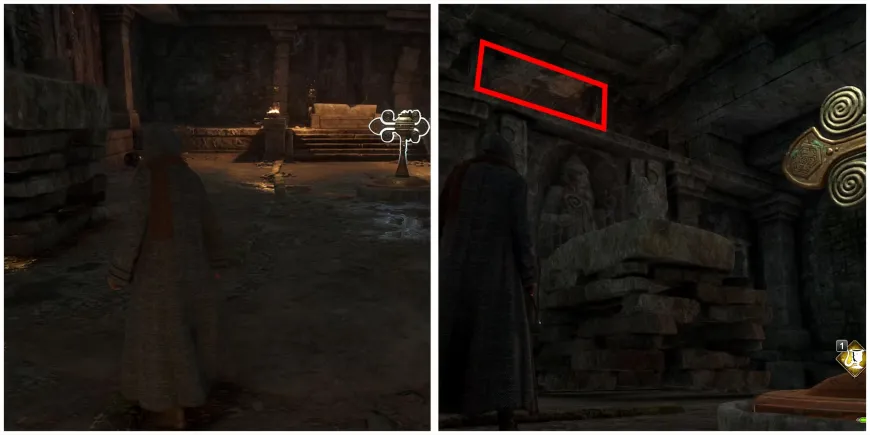 Оказавшись внутри, несколько раз наложите заклинание Depulso на механизм, чтобы сдвинуть камни, которые создадут платформу для подъема, чтобы добраться до сундука, содержащего предмет.