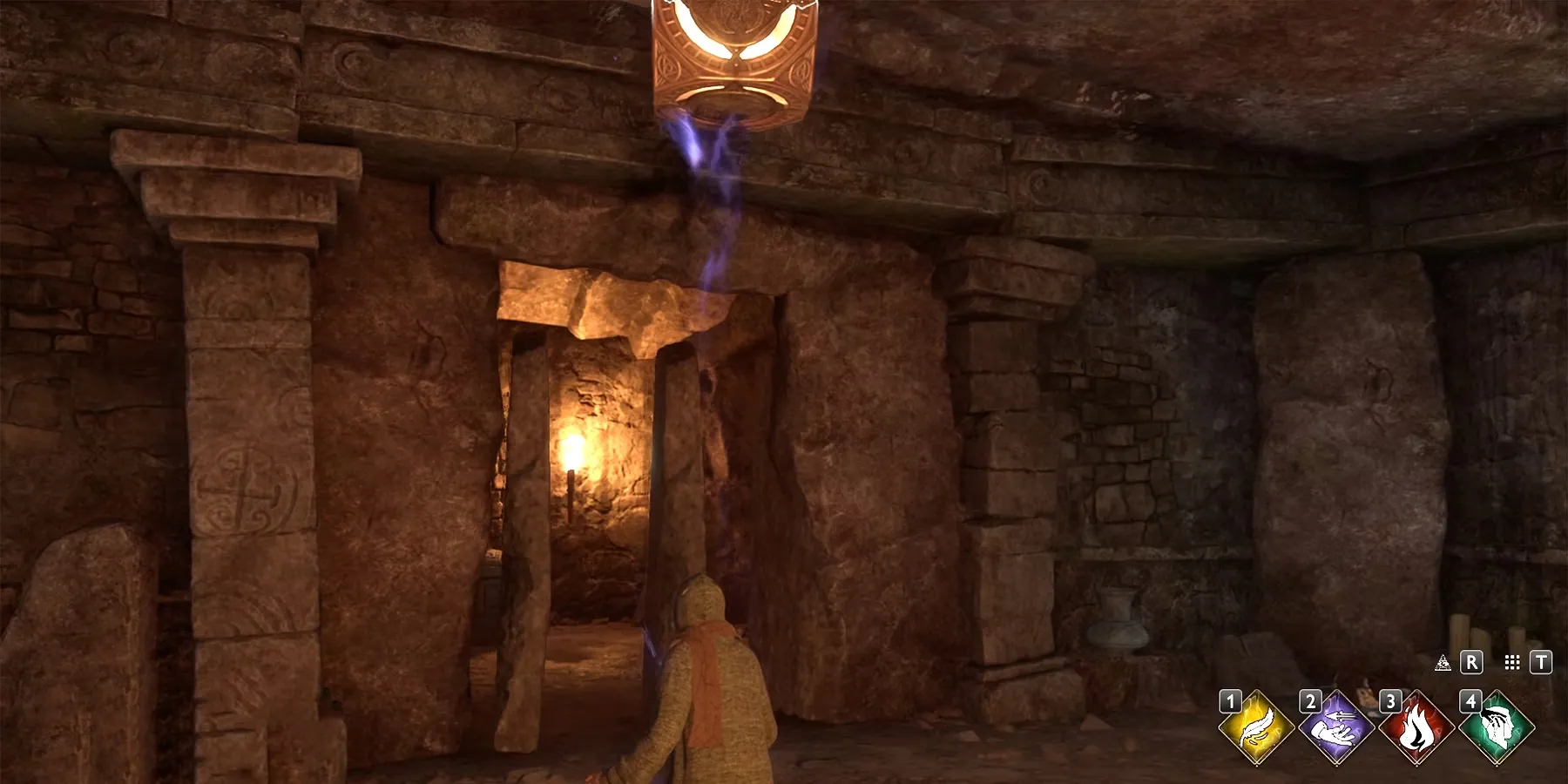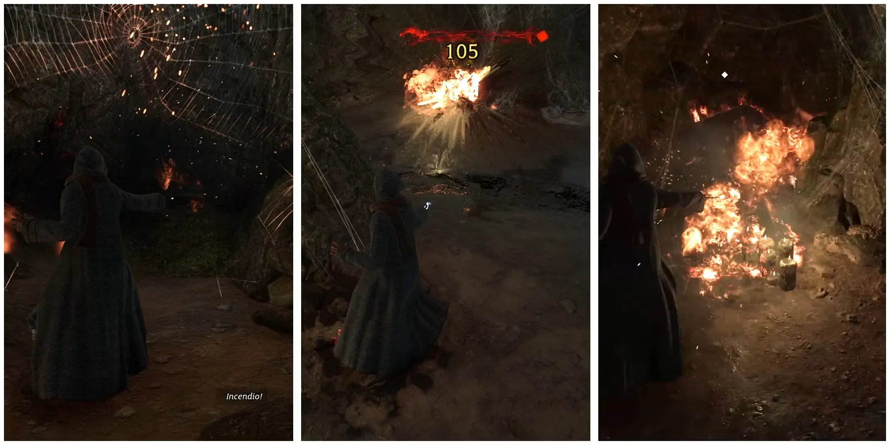 Оказавшись внутри, игроки должны использовать любое огненное заклинание, чтобы сжечь паутину и победить пауков, охраняющих сундук. Затем сожгите паутину вокруг сундука, чтобы получить предмет.