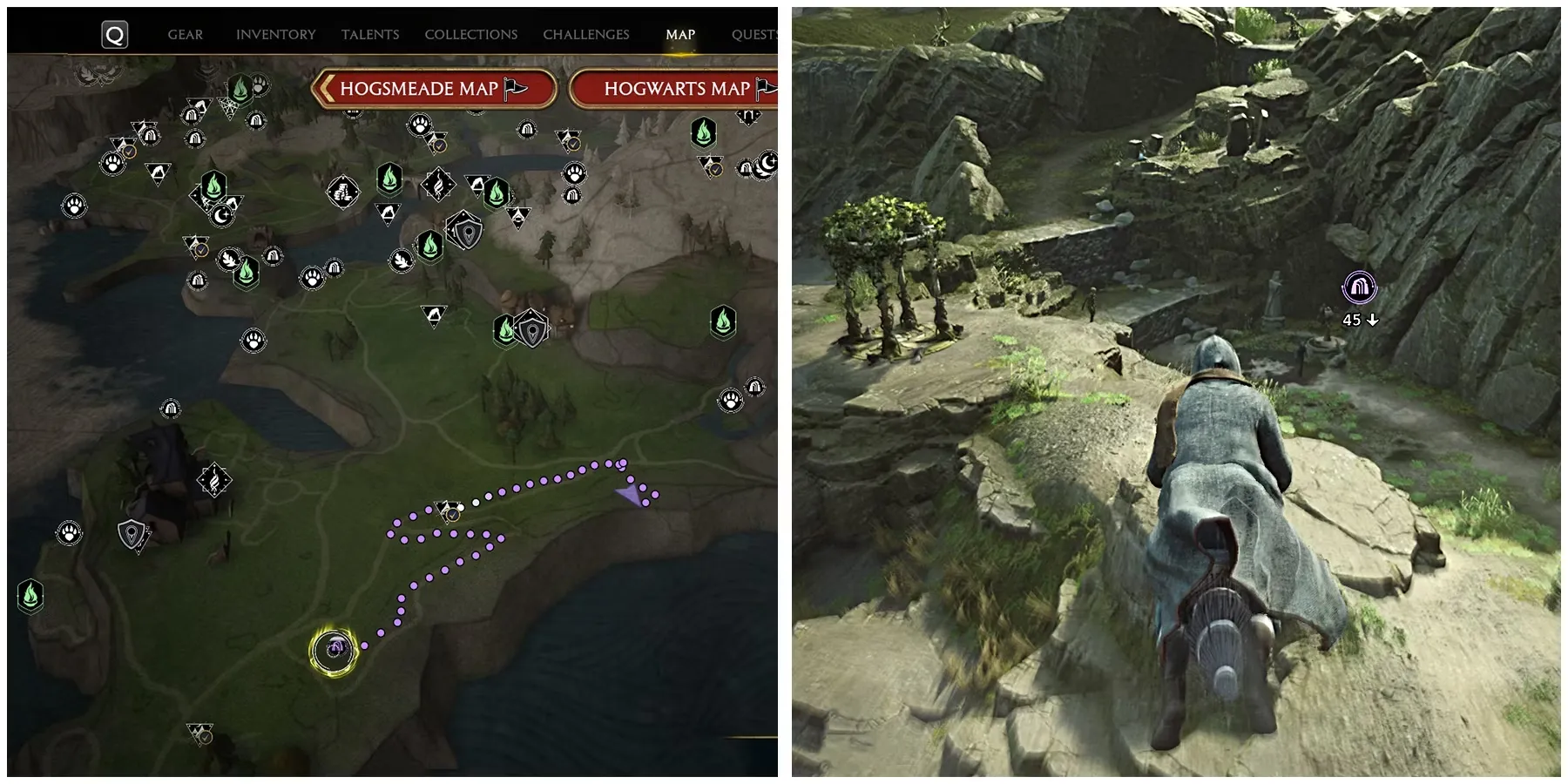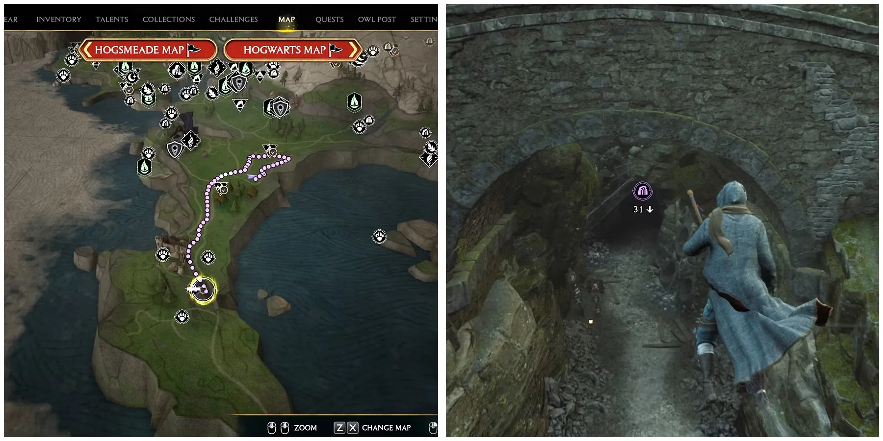 Внутри пещеры находится головоломка, для решения которой необходимо использовать Wingardium Leviosa, чтобы заставить куб левитировать и поместить его в правильное положение со стрелкой, направленной вниз. Как только головоломка будет решена, дверь сокровищницы откроется, и игроки смогут получить свою награду.
