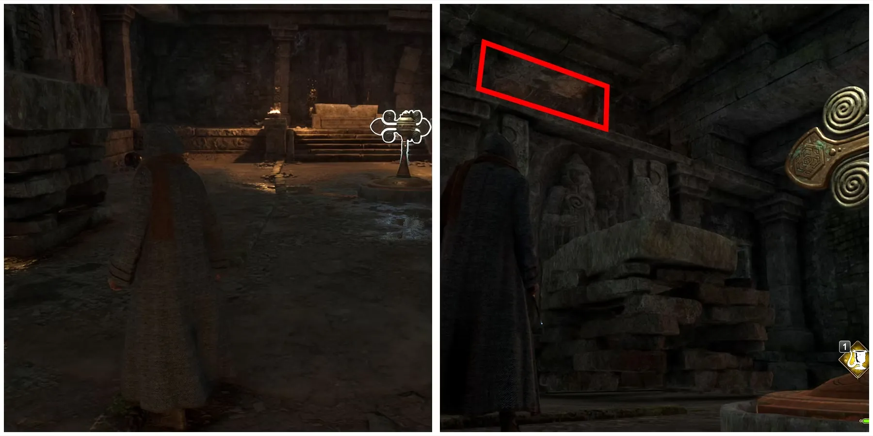Оказавшись внутри, несколько раз наложите заклинание Depulso на механизм, чтобы сдвинуть камни, которые создадут платформу для подъема, чтобы добраться до сундука, содержащего предмет.