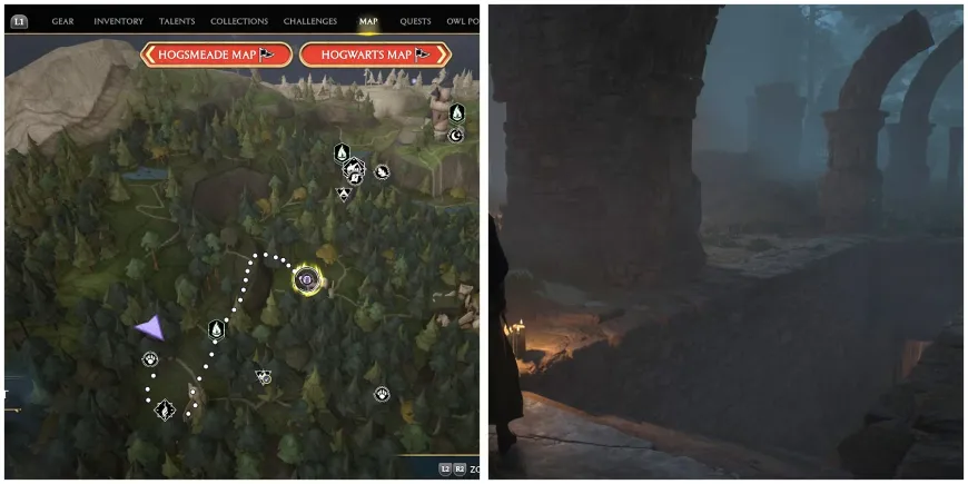 Телепортируйтесь обратно к путевой точке западного запретного леса, но на этот раз идите на северо-восток, чтобы добраться до третьего хранилища сокровищ в Hogwarts Legacy. В подземелье невозможно войти, пока игроки не достанут заколдованный куб и не вернут его на место. Куб можно найти к северо-западу от платформы.