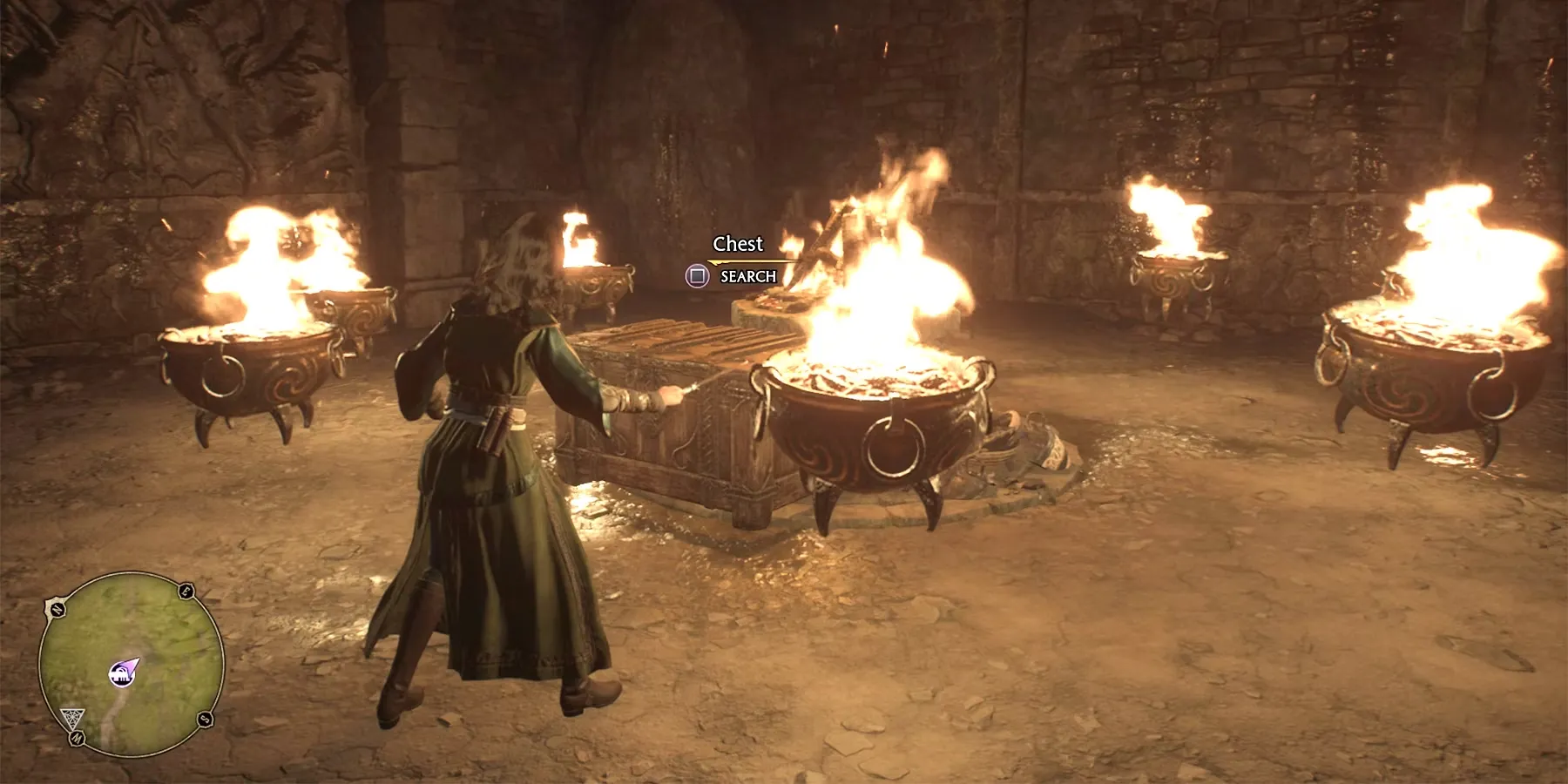 Внутри пещеры можно увидеть несколько котлов, расположенных вокруг костра. Три из них, однако, не горят. Прицельтесь в них и используйте любое заклинание огня, например Incendio, Confringo или Bombarda, чтобы зажечь котлы и заполучить сундук.