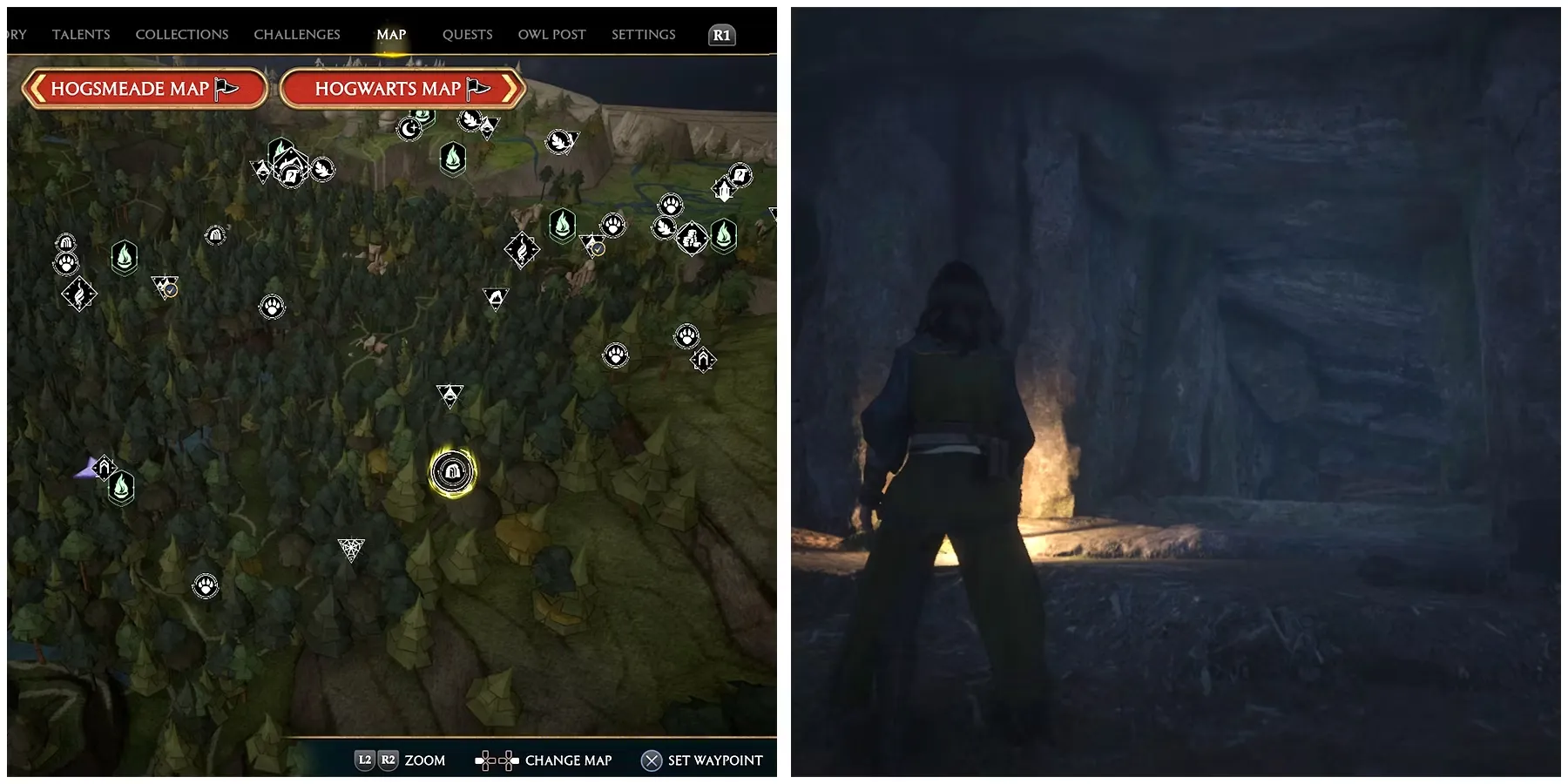 Теперь отправляйтесь в западный запретный лес и идите на запад, чтобы увидеть хранилище сокровищ на вершине холма. Откройте ворота с помощью Depulso или Accio и пройдите внутрь пещеры.