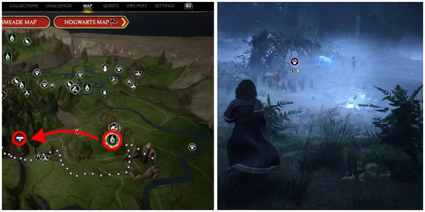 Хотя мир Hogwarts Legacy огромен, единорогов можно встретить только в одном единственном месте, которое находится к северо-западу от Верхнего Хогсфилда. Чтобы добраться до него, игроки могут телепортироваться в Верхний Хогсфилд и спуститься в логово единорогов пешком, с метлой или верхом на звере в Hogwarts Legacy.