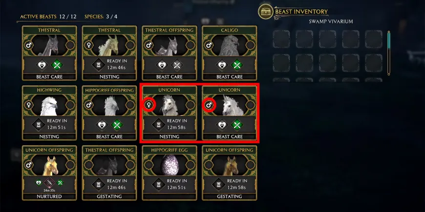Чтобы открыть возможность разведения зверей, игроки должны приобрести чертежи загона для разведения зверей в магазине Tomes and Scrolls в Хогсмиде. После этого отправляйтесь в выручай-комнату и используйте заклинание колдовства в Hogwarts Legacy, чтобы создать питомник для разведения зверей внутри нужного вивария. Взаимодействуйте с книгой перед загоном, и единорог должен появиться в качестве опции, если у игроков есть обе версии в виварии.