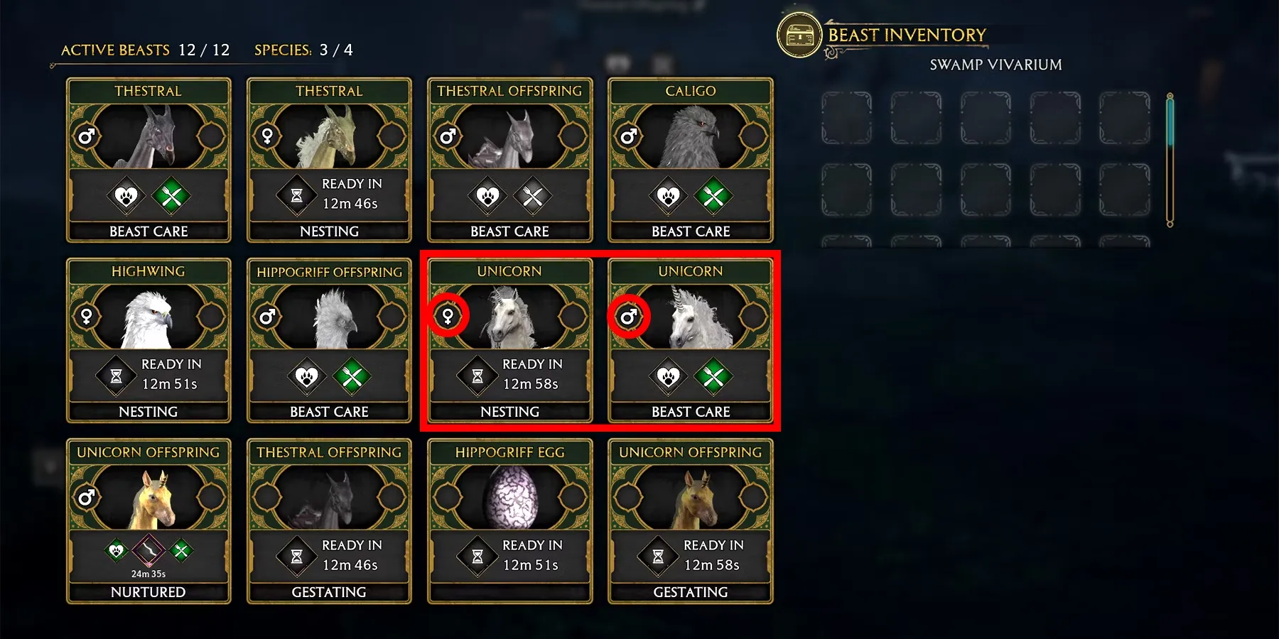 Как и любое существо из Hogwarts Legacy, игроки могут разводить единорогов, хотя это и требует больше времени, чем у других зверей, поскольку процесс требует дополнительных действий. В отличие от других существ, которых можно встретить группами, единорога можно увидеть только одного при посещении его места обитания возле Верхнего Хогсфилда. Это означает, что он может быть либо самцом, либо самкой, что вынуждает игроков заходить в логово зверя несколько раз.