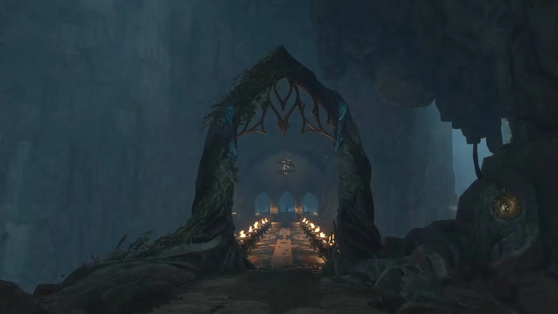 Теперь пришло время вернуться на тропу и направиться в противоположном направлении, чтобы добраться до новых пауков и еще одной двери-головоломки. Третья руна находится слева и скрыта стенами пещеры при первом входе в эту зону, но суть ее та же, что и раньше, поэтому нажмите все три руны, чтобы открыть дверь и продолжить сборку моста.