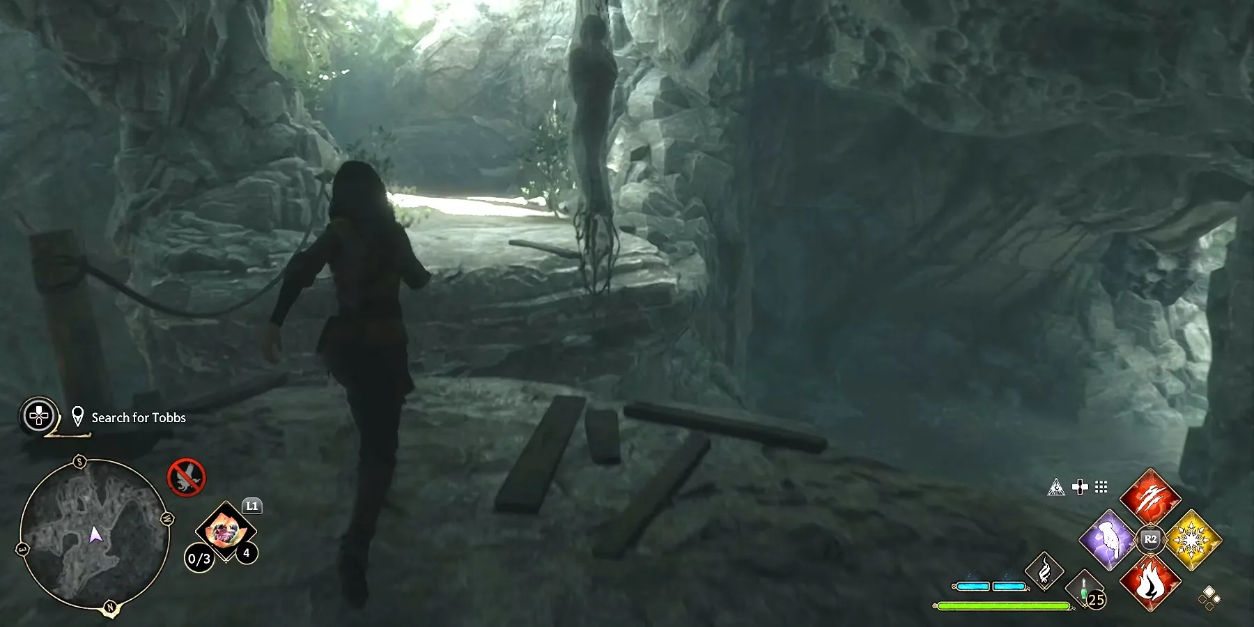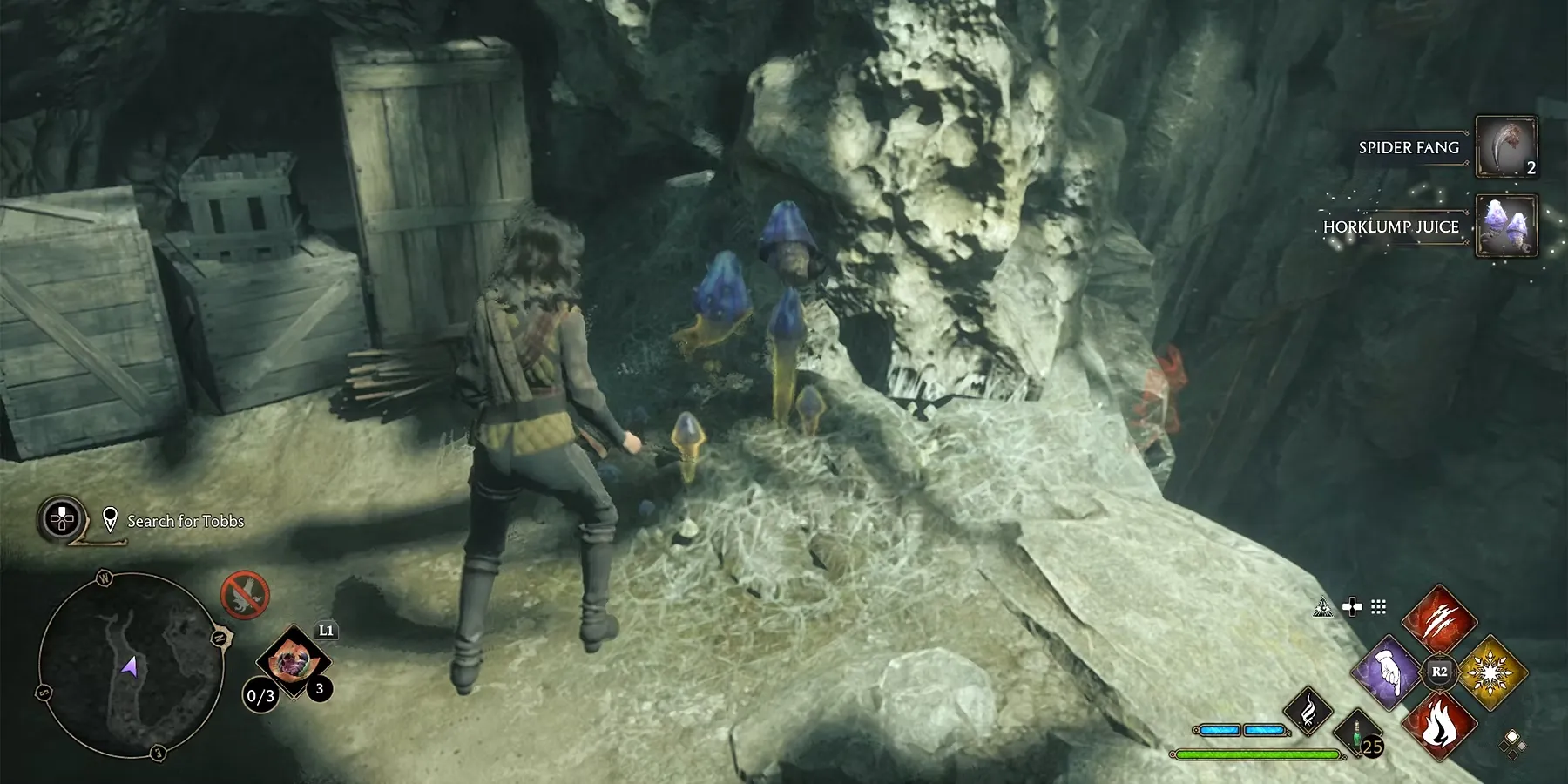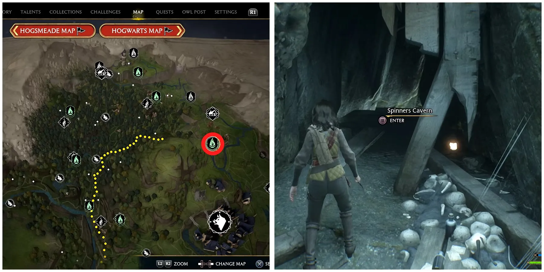 Чтобы завершить квест «Бедственное положение домового эльфа», протагонисты должны найти Тоббса в пещере и сообщить об этом Дику. Сначала отправляйтесь в отмеченное на Карте мира место, телепортировавшись в Верхний Хогсфилд. От этой точки можно либо идти пешком, либо использовать метлу или летающую лошадь, чтобы добраться до входа в пещеру Прядильщиков.