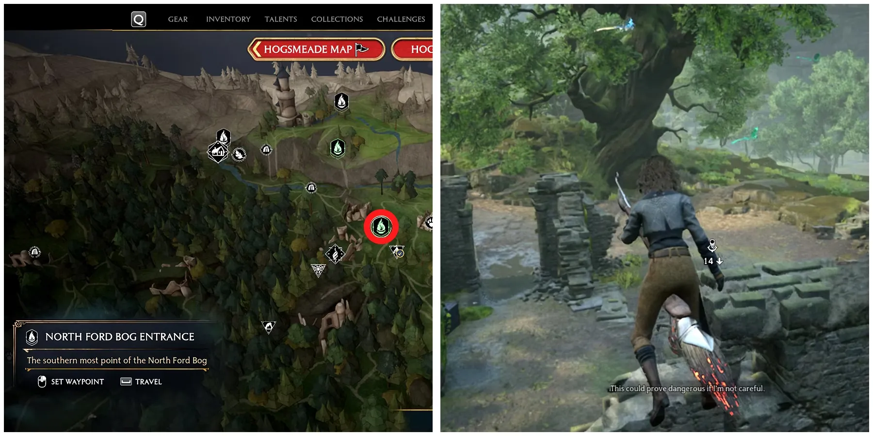- Телепортироваться к входу в болото Норд-Форд или использовать метлу, чтобы перелететь в отмеченное на карте место.