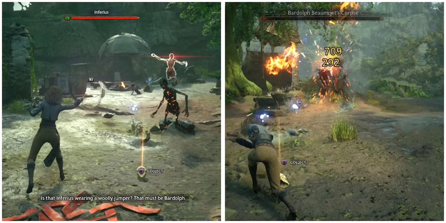 Прибыв в руины, игроки обнаружат, что они кишат Инфериусами. Последних нужно поразить огненными заклинаниями или взрывными бочками, чтобы сделать их уязвимыми для других атак. После победы над ними труп Бардольфа Бомонта поднимется из земли руин и нападет. У главного героя не останется другого выбора, кроме как убить труп мальчика, поскольку он превратился в Инфериуса. За убийство мальчика игроки получат в награду его Рваный джемпер. Далее вернитесь в Верхний Хогсфилд, чтобы рассказать Клэр Бомонт о судьбе ее брата. Для этого:
