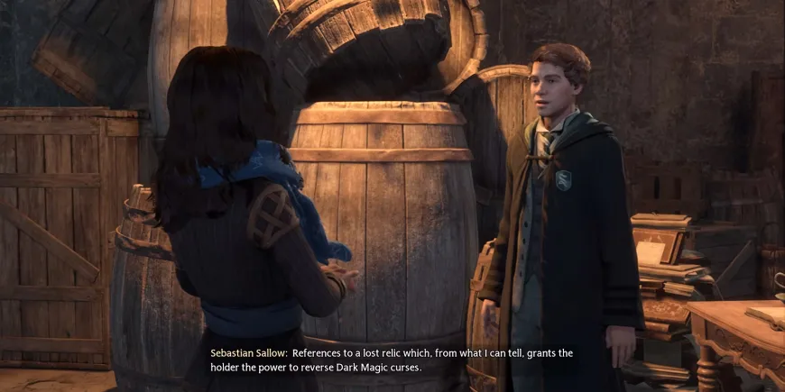 Быстро переместитесь в башню защиты от темных искусств и следуйте по отмеченному пути, чтобы попасть в подземный этаж. Встретив Себастьяна, мальчик начинает рассказывать, как хорошо идут его исследования. Оказывается, в книге заклинаний Салазара Слизерина упоминается потерянная реликвия, которая обладает способностью обращать вспять проклятия темной магии, что делает ее идеальным предметом для лечения проклятия Анны.