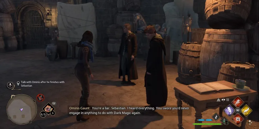 Как обычно, Оминис и Себастьян спорят об использовании темной магии, поскольку первого она пугает, а второй считает ее ступенькой к достижению своей цели. Как только Себастьян покинет подвал, сказав Оминису, чтобы тот оставил его в покое, игроки получат возможность поговорить со слепым Слизеринцем.