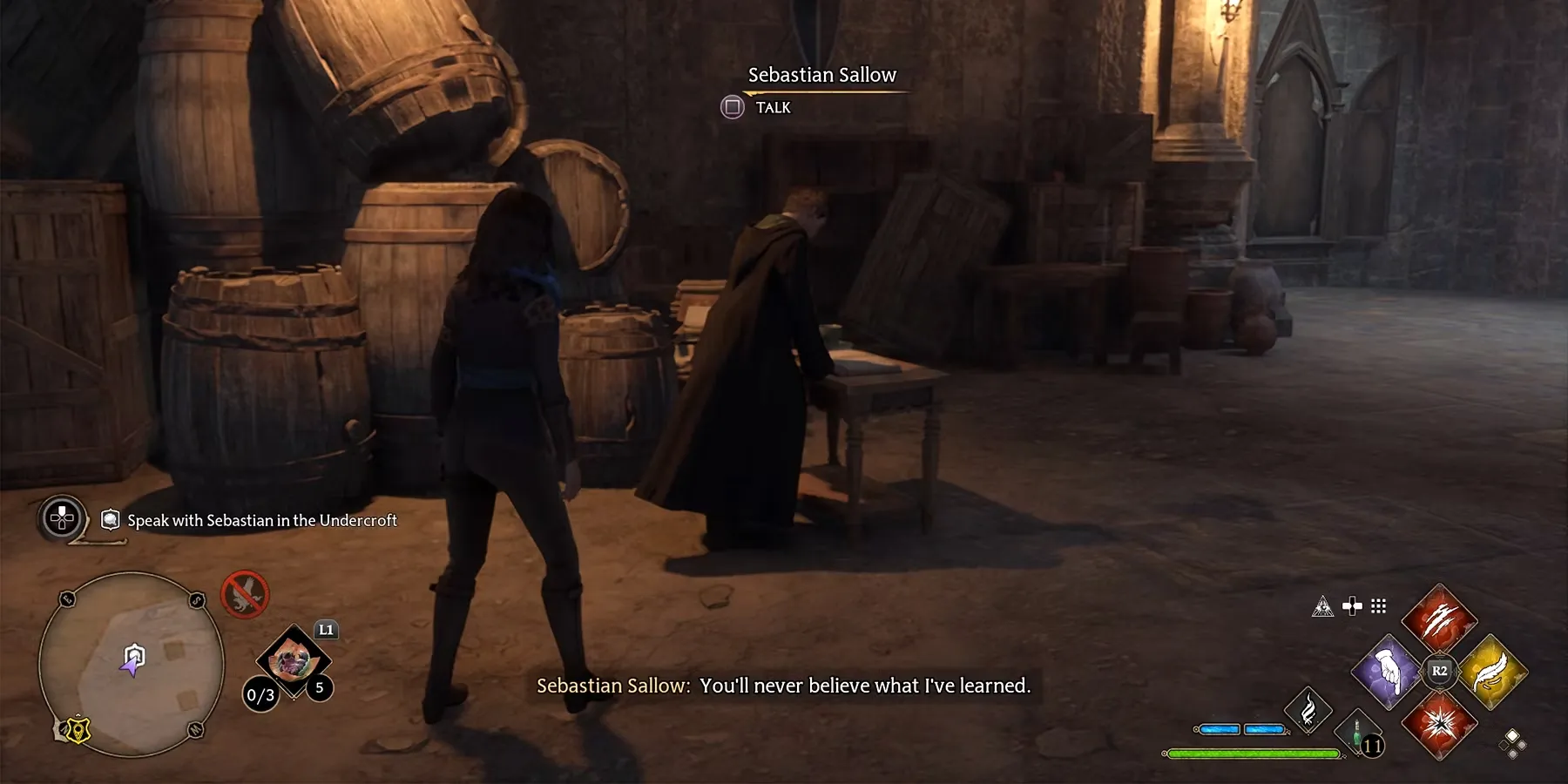Как обычно, Оминис и Себастьян спорят об использовании темной магии, поскольку первого она пугает, а второй считает ее ступенькой к достижению своей цели. Как только Себастьян покинет подвал, сказав Оминису, чтобы тот оставил его в покое, игроки получат возможность поговорить со слепым Слизеринцем.