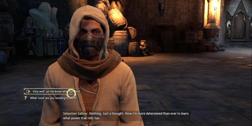 Кровь Себастьяна закипает, и он защищается, говоря, что сделал то, что должен был сделать, чтобы защитить Анну, и что Соломон не имеет права изгонять его от собственной сестры-близняшки. Тем не менее, этот разговор только подстегивает решимость Себастьяна излечить проклятие Анны с помощью реликвии, найденной в предыдущем квесте.