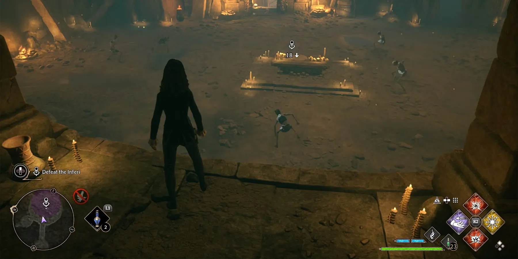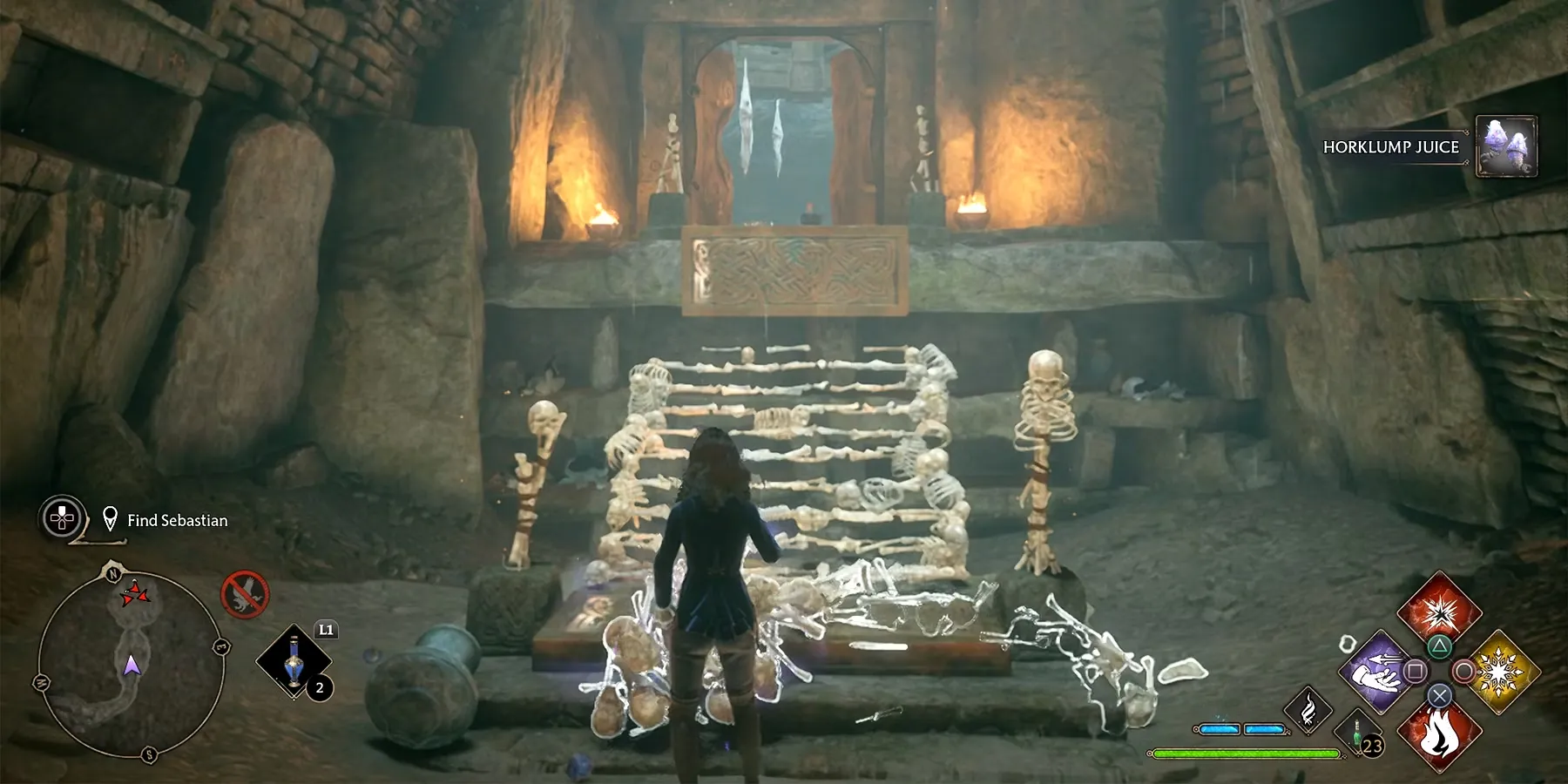 Когда разговор будет окончен, продолжайте идти на восток, чтобы попасть в комнату с более высокой платформой. На нее невозможно подняться, не решив небольшую головоломку в Hogwarts Legacy, в которой участвуют скелеты.