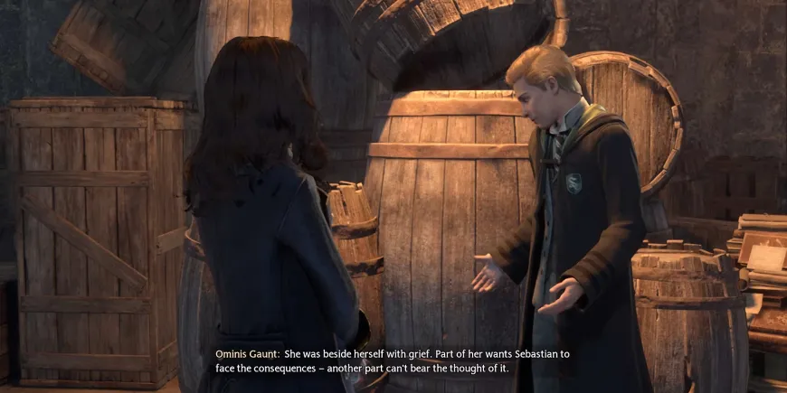Как только игроки окажутся внутри, можно услышать фрагмент разговора Оминиса и Себастьяна. Первый ругает второго за то, что Анне пришлось хоронить дядю в одиночку, а она опустошена и подумывает выдать брата. Себастьян же пытается оправдаться, говоря, что ему пришлось использовать заклинание Авада Кедавра из Hogwarts Legacy на своем дяде, чтобы спасти Анну.