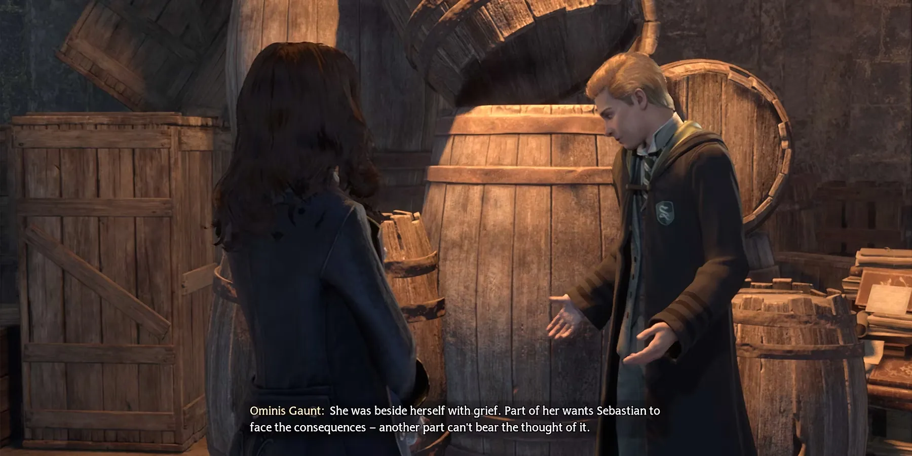 Как только игроки окажутся внутри, можно услышать фрагмент разговора Оминиса и Себастьяна. Первый ругает второго за то, что Анне пришлось хоронить дядю в одиночку, а она опустошена и подумывает выдать брата. Себастьян же пытается оправдаться, говоря, что ему пришлось использовать заклинание Авада Кедавра из Hogwarts Legacy на своем дяде, чтобы спасти Анну.