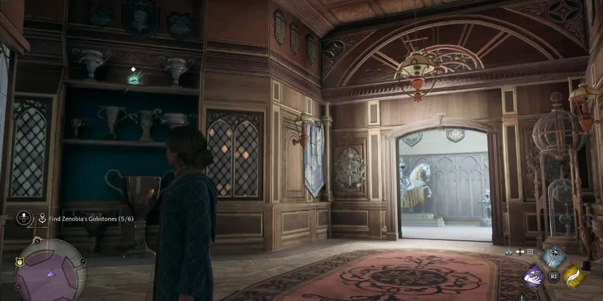 Следуя по светящемуся пути, игроки попадут в башню Рейвенкло, а затем в голубой коридор с большими колоннами и арками. Поднимите взгляд на третью колонну справа, и игроки увидят сверкающий гобстоун, который ждет заклинания Accio, чтобы опустить его вниз.