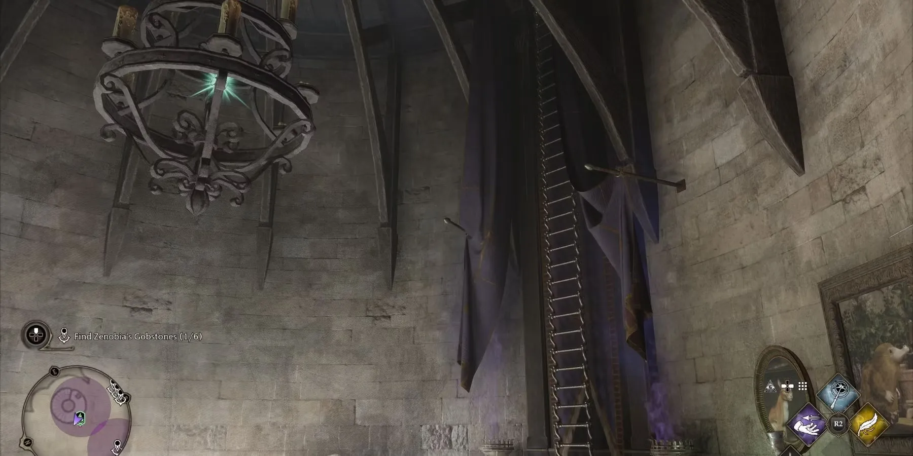 Хотя может возникнуть соблазн подняться по лестнице в поисках камня, на самом деле он находится на люстре, висящей над лестницей, по которой игрок только что поднялся. И снова используйте Accio, чтобы снять Гобстоун с люстры, показанной на рисунке выше.