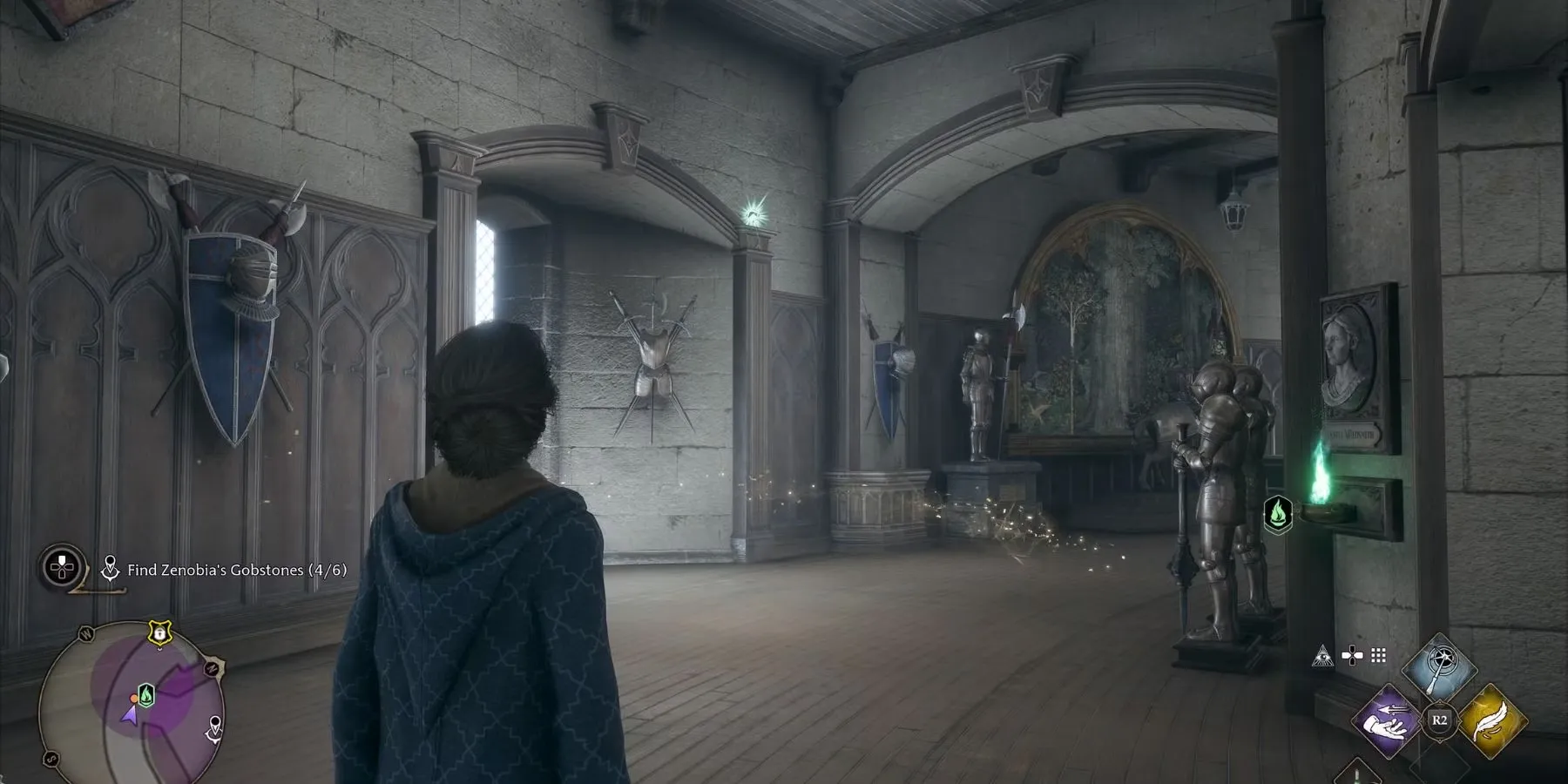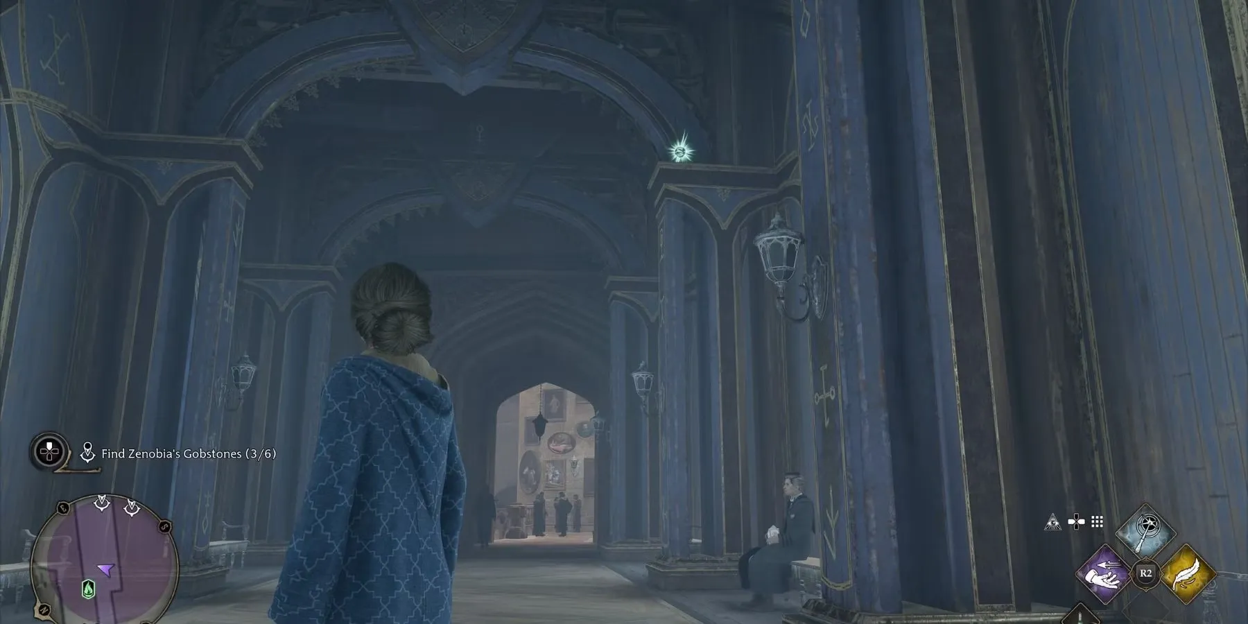 Следуя по светящемуся пути, игроки попадут в башню Рейвенкло, а затем в голубой коридор с большими колоннами и арками. Поднимите взгляд на третью колонну справа, и игроки увидят сверкающий гобстоун, который ждет заклинания Accio, чтобы опустить его вниз.