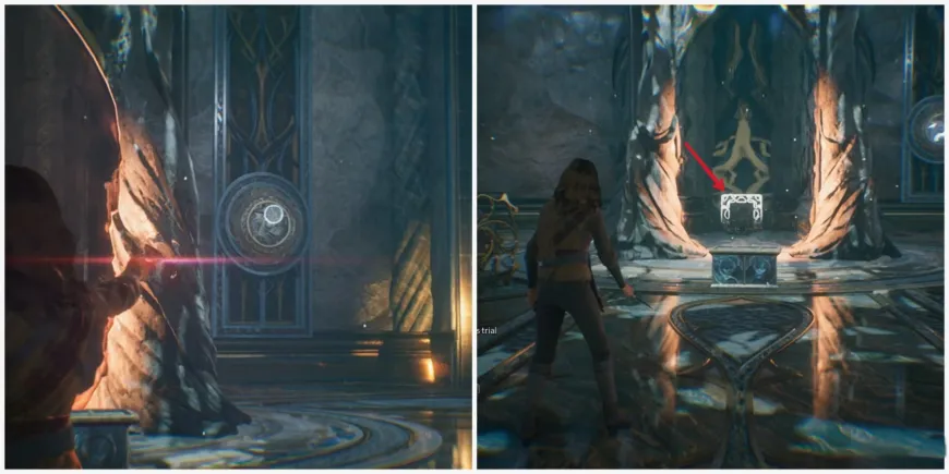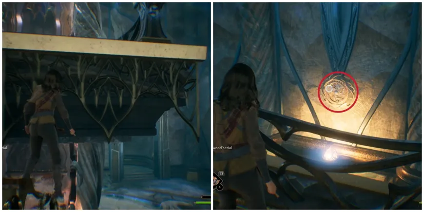 Перейдите через мост и исследуйте резервуар Древней магии, чтобы начать вторую часть испытания в Hogwarts Legacy. Цель - убрать столб, преграждающий путь.