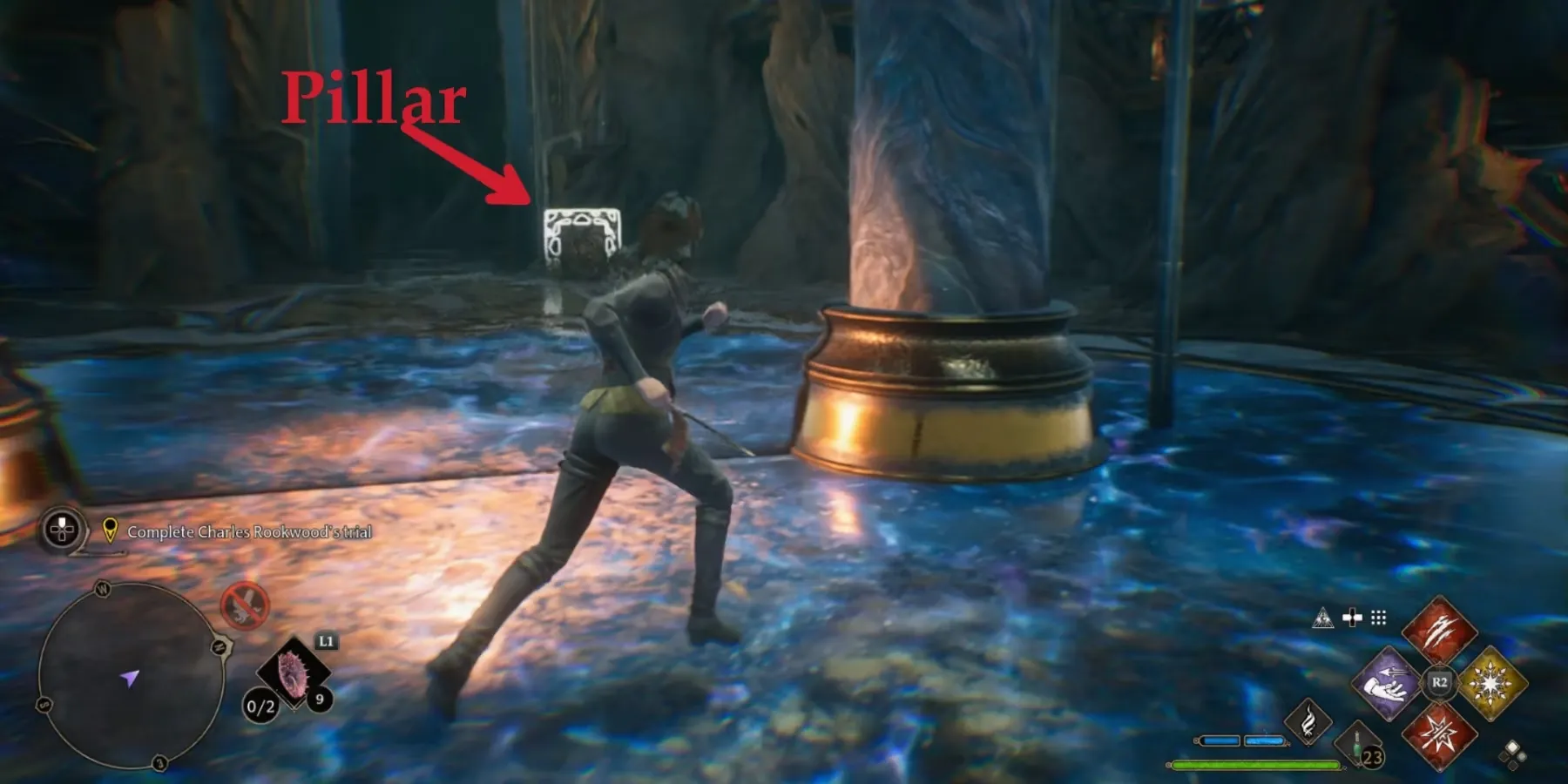 Перейдите через мост и исследуйте резервуар Древней магии, чтобы начать вторую часть испытания в Hogwarts Legacy. Цель - убрать столб, преграждающий путь.