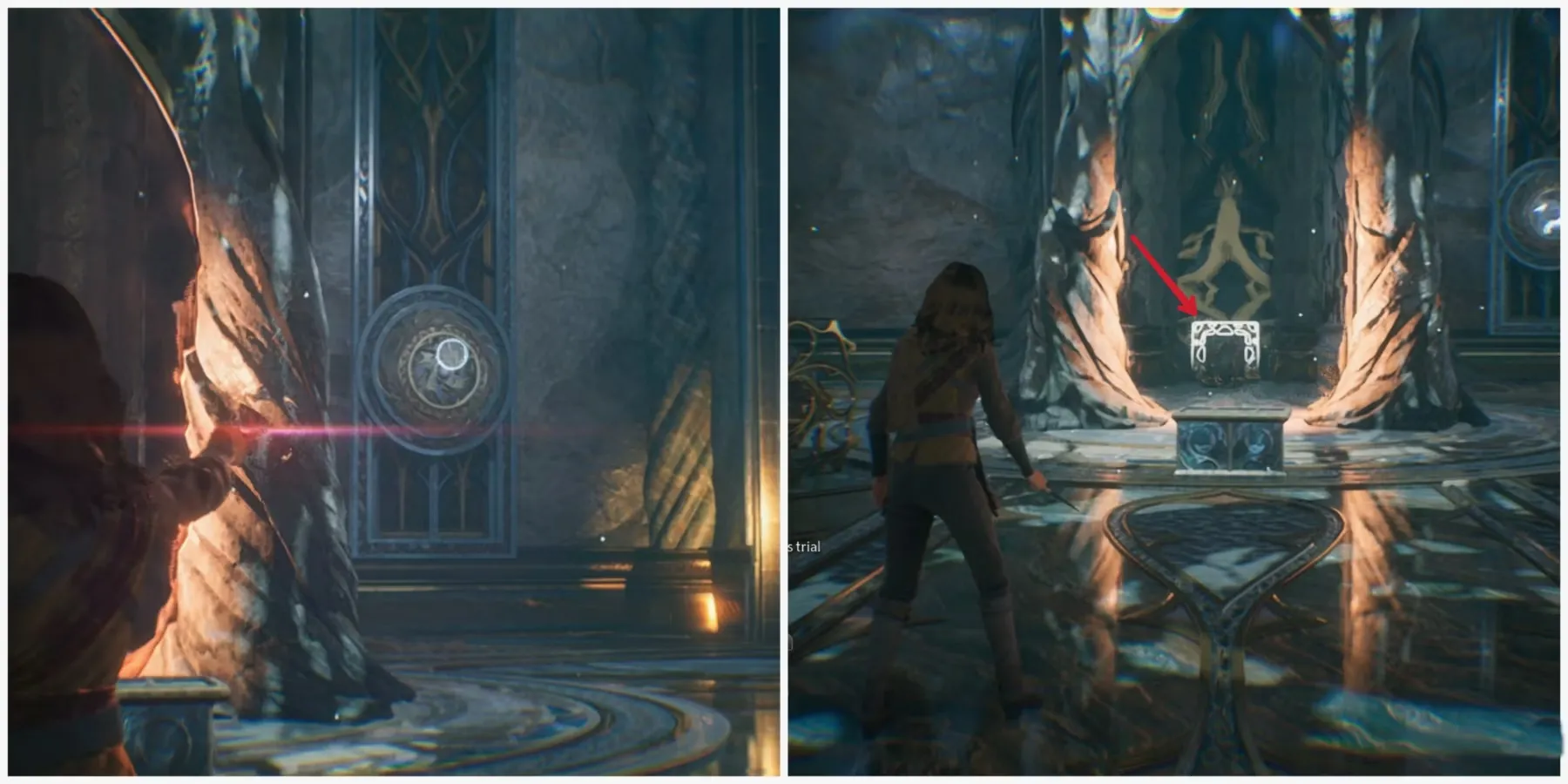 - Встаньте перед порталом и нажмите на сигил с правой стороны, чтобы повернуть его. В результате неподвижный столб превратится в куб.