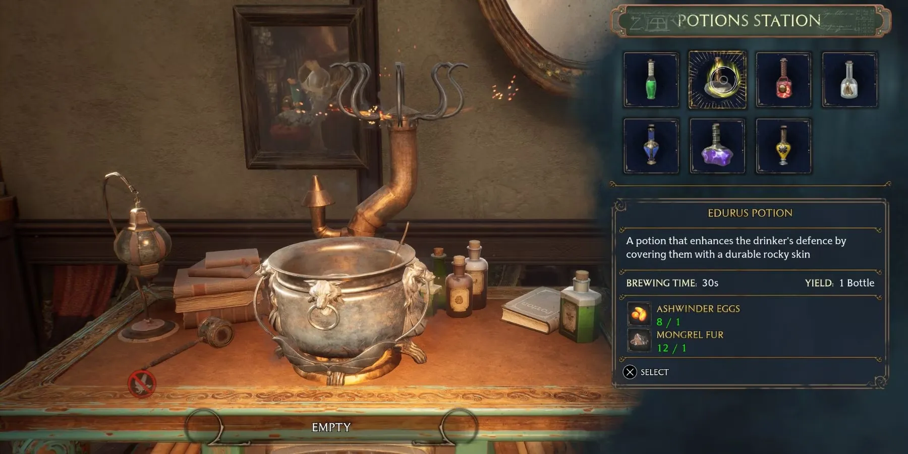 Для приготовления зелья Эдуруса требуется станция зелий. Впервые игроки открывают станцию зелий после посещения первого занятия по зельям, но больше станций зелий можно получить в выручай-комнате.