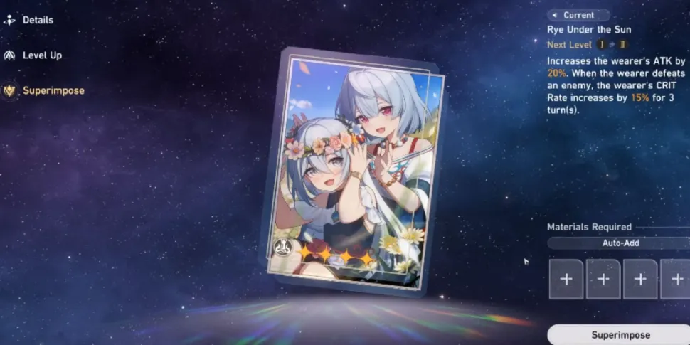 Игра Honkai: Star Rail пользуется большим успехом в игровом мире, и это вполне оправданно. Захватывающие возможности и отлично продуманные приключения привлекли внимание игроков по всему миру. Функция Superimpose в Honkai: Star Rail позволяет игрокам объединять два одинаковых световых конуса для повышения эффективности игры. Каждый световой конус обладает уникальной пассивной способностью, повышающей характеристики персонажа и статистику игрока, что способствует повышению общего игрового опыта. Один световой конус имеет I ранг и может быть усилен путем наложения друг на друга, достигая максимального V ранга.