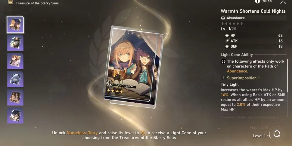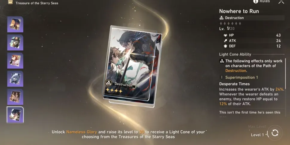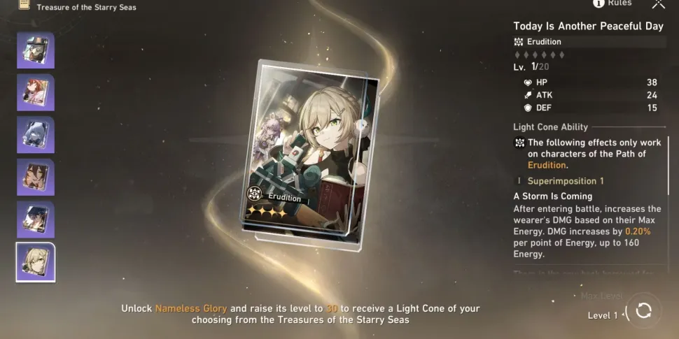 На 30-м уровне Honkai: Star Rail's Nameless Glory игрокам предлагается выбор из семи световых конусов, основанных на каждом пути. Решение о том, какой из них выбрать, в конечном итоге зависит от индивидуального стиля игры игрока и его списка персонажей. Прежде чем принять решение, игроки должны внимательно изучить статистику и пассивные способности светового конуса, а также то, насколько они соответствуют их желаемому стилю игры. Кроме того, игрокам следует подумать о том, какие персонажи у них есть и какой световой конус принесет им наибольшую пользу.