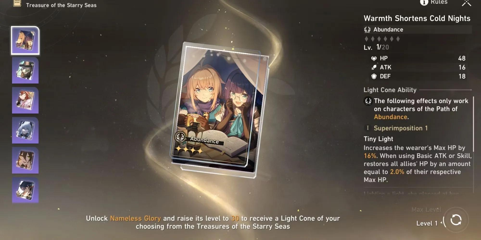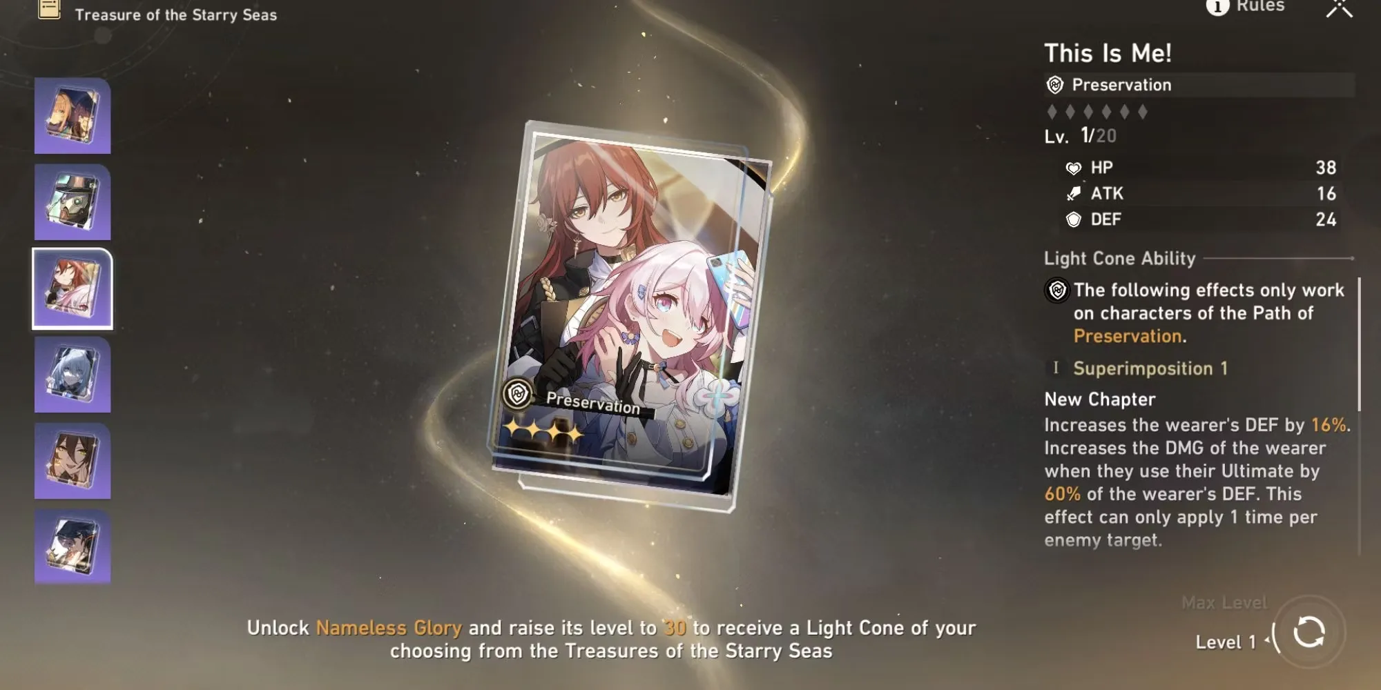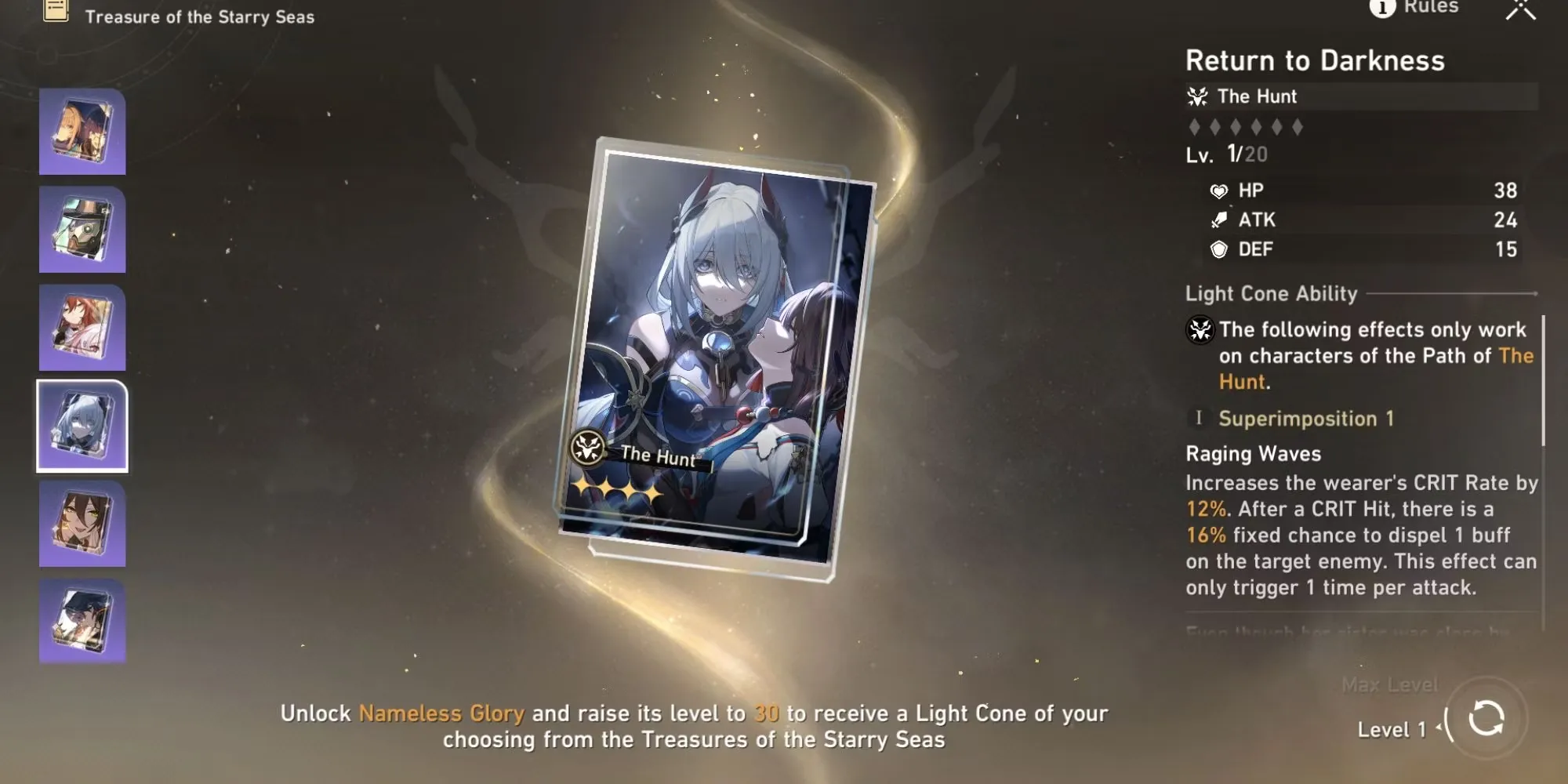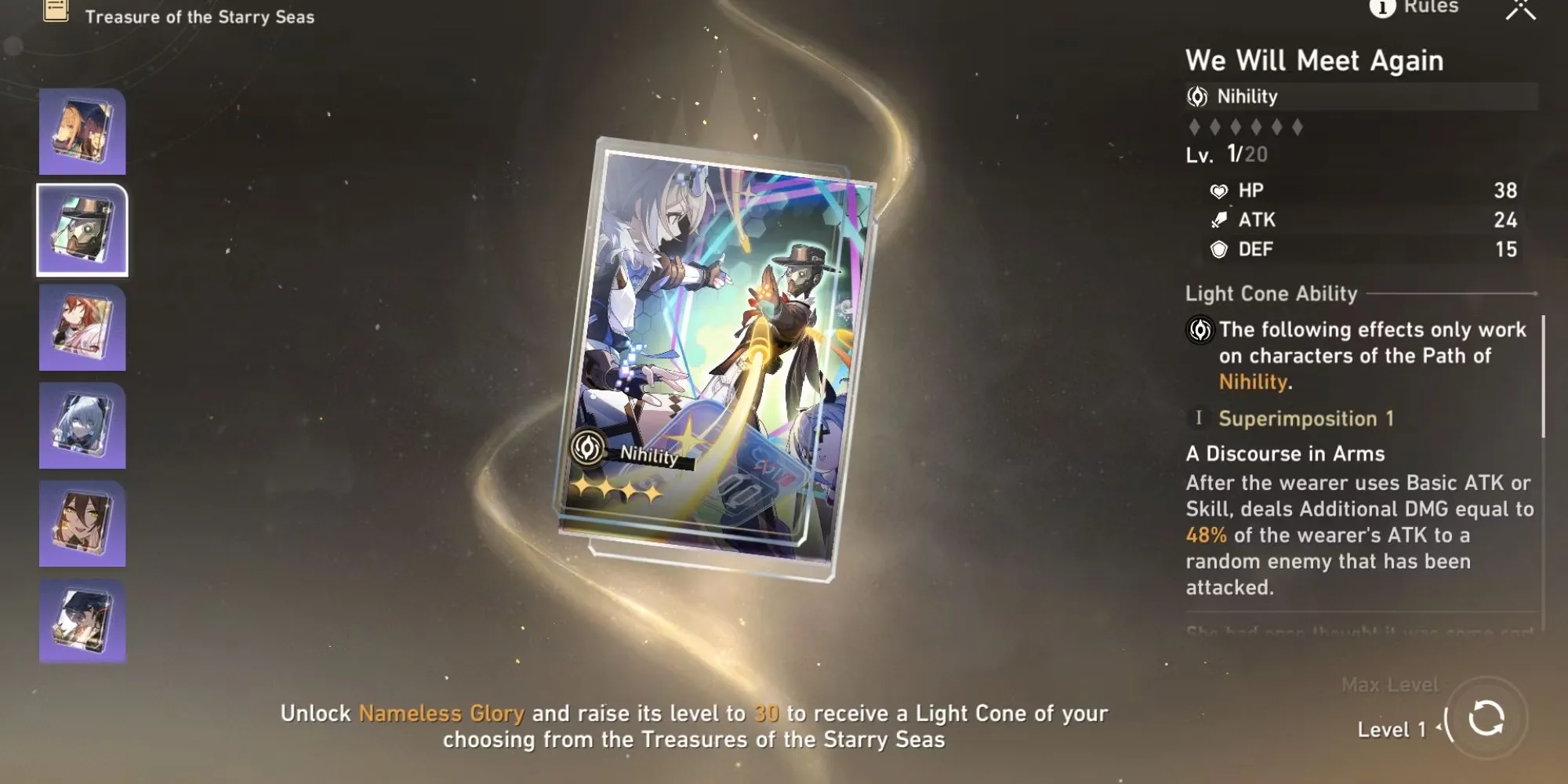 На 30-м уровне Honkai: Star Rail's Nameless Glory игрокам предлагается выбор из семи световых конусов, основанных на каждом пути. Решение о том, какой из них выбрать, в конечном итоге зависит от индивидуального стиля игры игрока и его списка персонажей. Прежде чем принять решение, игроки должны внимательно изучить статистику и пассивные способности светового конуса, а также то, насколько они соответствуют их желаемому стилю игры. Кроме того, игрокам следует подумать о том, какие персонажи у них есть и какой световой конус принесет им наибольшую пользу.