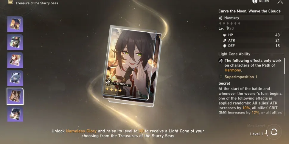 Второй лучший вариант светового конуса для Тингун - Carve the Moon, Weave the Clouds, который можно получить, только купив его за реальные деньги и достигнув 30-го уровня в боевом пропуске Nameless Honor. Хотя этот вариант более ограничен, он все равно является отличным выбором для игроков, готовых вложить деньги в дополнительные награды. Этот легкий конус имеет сходство с Widsith из Genshin Impact, поскольку он дает случайный бонус ATK%, ER% или Crit DMG% в начале боя и когда владелец совершает действие.