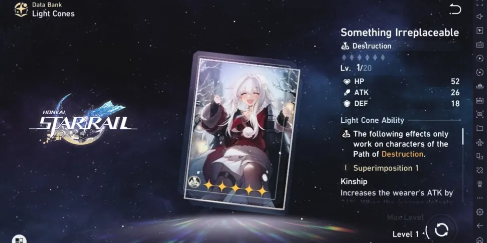 Хотя "Something Irreplaceable" - это абсолютное чудовище светового конуса, получить пятизвездочный световой конус может быть непросто. Если у вас его нет, игрокам следует выбрать другой световой конус, усиливающий атаку Клары.