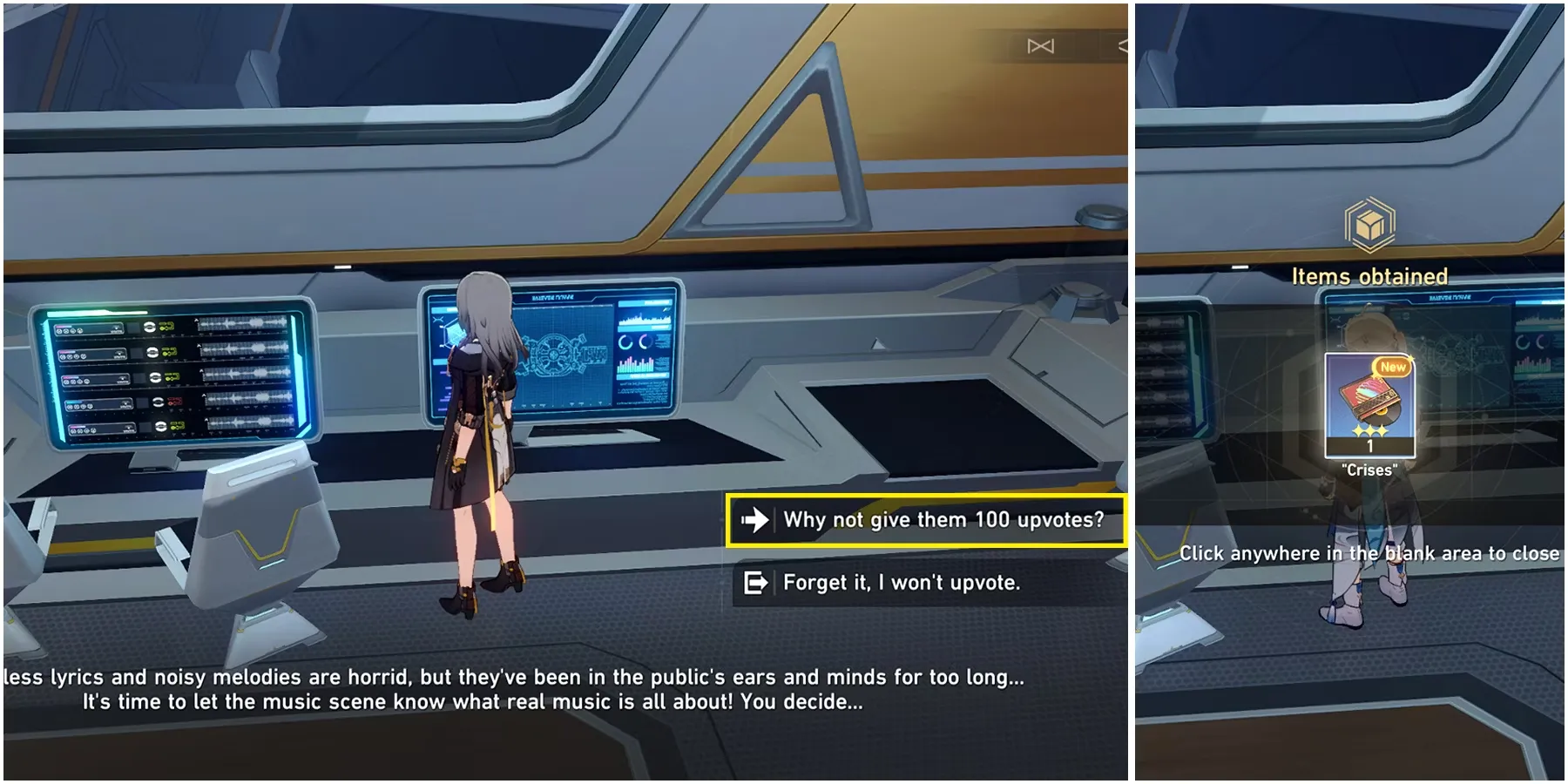 Исследуйте его, чтобы воспроизвести трек "Кризис", и продолжайте голосовать за него, чтобы получить диск с треком и 20 эртареумов.