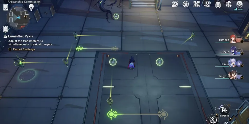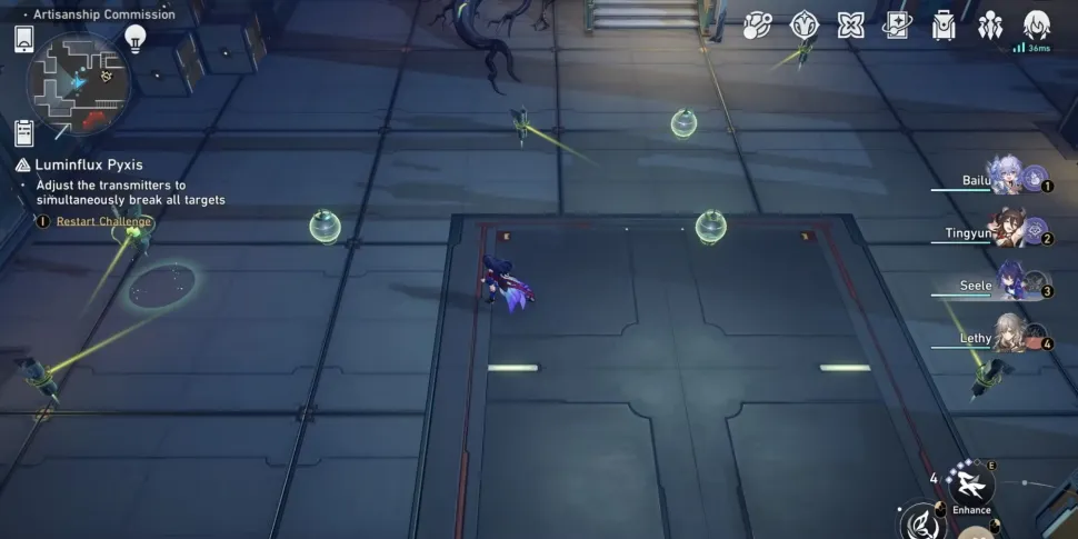 В отличие от версии сюжетного квеста, головоломки Luminflux Pyxis в Honkai: Star Rail требуют от игроков уничтожения орбов вместо катушек Ambrosial Arbor. Хотя концепция похожа, эти головоломки значительно сложнее тех, что встречаются в сюжетном режиме. Чтобы пройти эти головоломки, игроки должны вращать устройства так, чтобы перенаправить лучи света друг в друга и одновременно уничтожить все орбы на пути. Последнее устройство не требует завершения петли и соединения обратно со стартовым или любым другим устройством. У игроков есть возможность вращать устройства по часовой стрелке или против часовой стрелки, а затем нажать кнопку Launch на стартовом устройстве, чтобы попытаться уничтожить все шары. В случае неудачи игроки могут попытаться пройти головоломку несколько раз с разными настройками. Игроки смогут увидеть местность с высоты птичьего полета, чтобы легко отследить, куда будет направлен каждый луч света. Игроки также могут повторить попытку.