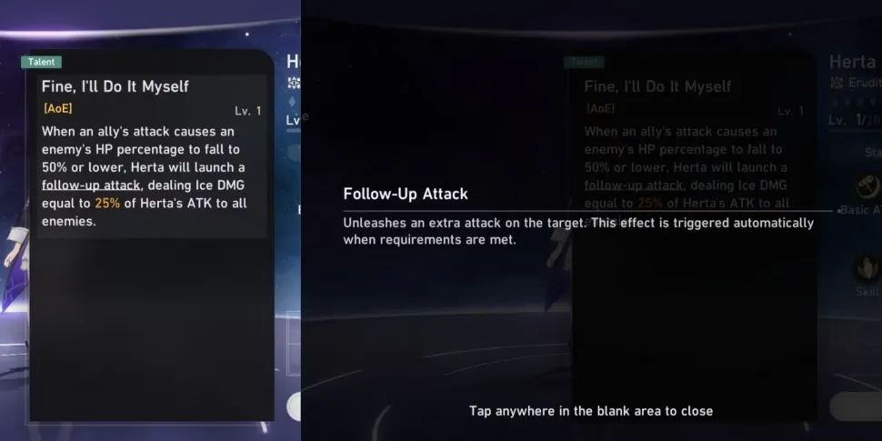 Например, Херта выполнит последующую атаку, если HP противника упадет до 50% или меньше (победа над ним также считается). Количество последующих атак Херты зависит от количества врагов, выполнивших это условие. Например, если в Honkai: Star Rail игроки победили сразу трех врагов с помощью Trailblazer, то Херта выполнит три последующие атаки.
