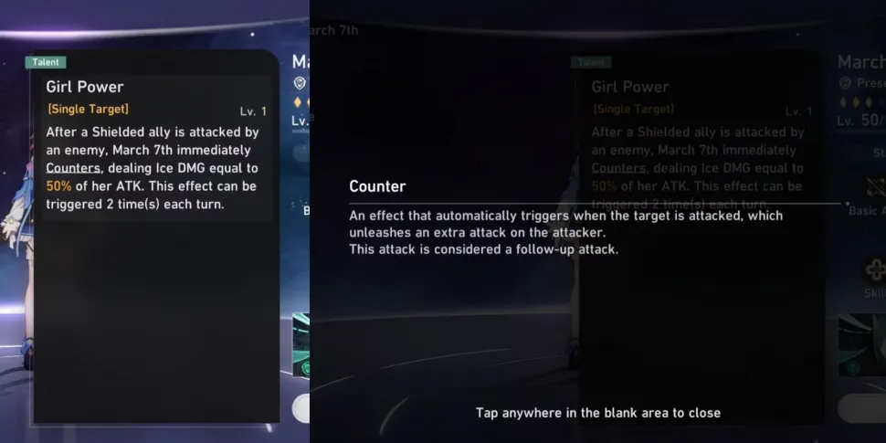 Помимо обычных последующих атак, каунтеры также считаются последующими атаками. Сюда относятся такие способности, как "March 7th" или "Clara's Talent". March считает, когда союзник со щитом получает удар, а Clara считает, когда ее саму атакуют.