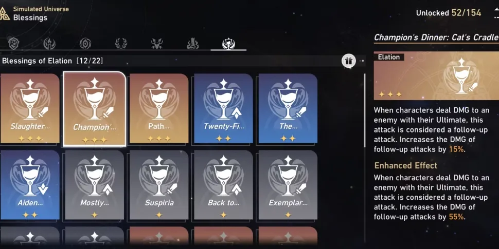 Однако если Следопытам посчастливилось получить Ужин чемпиона: Cat's Cradle, то будет отличной идеей набрать побольше благословений Elation. Этот бафф превращает все ульты в последующие атаки, увеличивая урон на 15% (55% после улучшения). Если игроки сосредоточатся на усилении этого благословения, они смогут эффективно разрушать стойкость противника, наносить большой урон, накапливать много крита и даже с легкостью восстанавливать очки умений.