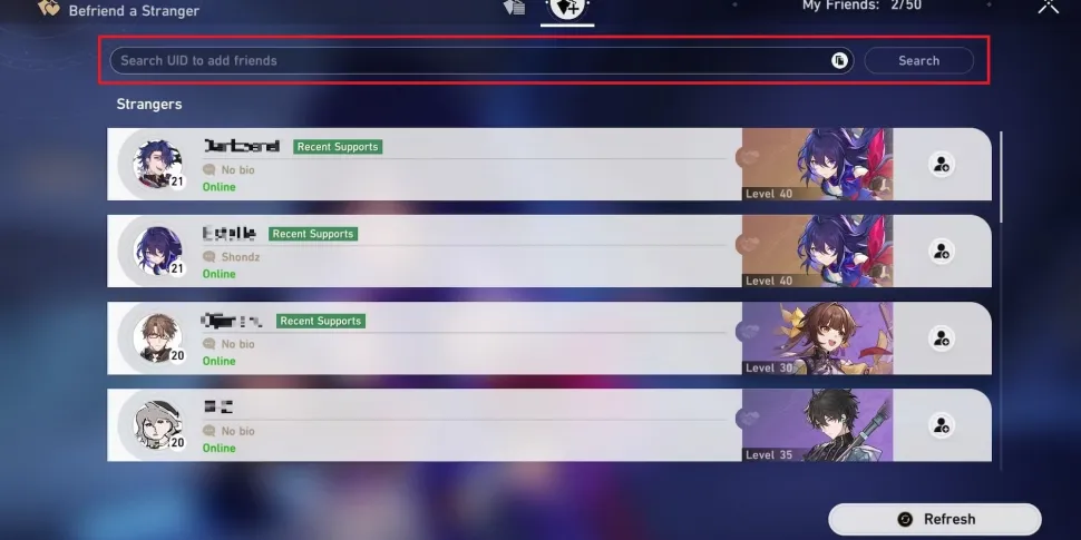 Чтобы отправить запрос на дружбу, нажмите на вторую кнопку в верхней части экрана. Здесь игроки увидят случайный список незнакомцев, а также текстовую строку, в которую можно ввести UID других людей. Попросите друзей узнать их UID, а затем скопируйте и вставьте их в строку поиска. Вскоре их профиль Honkai Star Rail появится на экране результатов. Поскольку UID уникален для каждого пользователя, игроки могут быть уверены в точности результатов поиска.