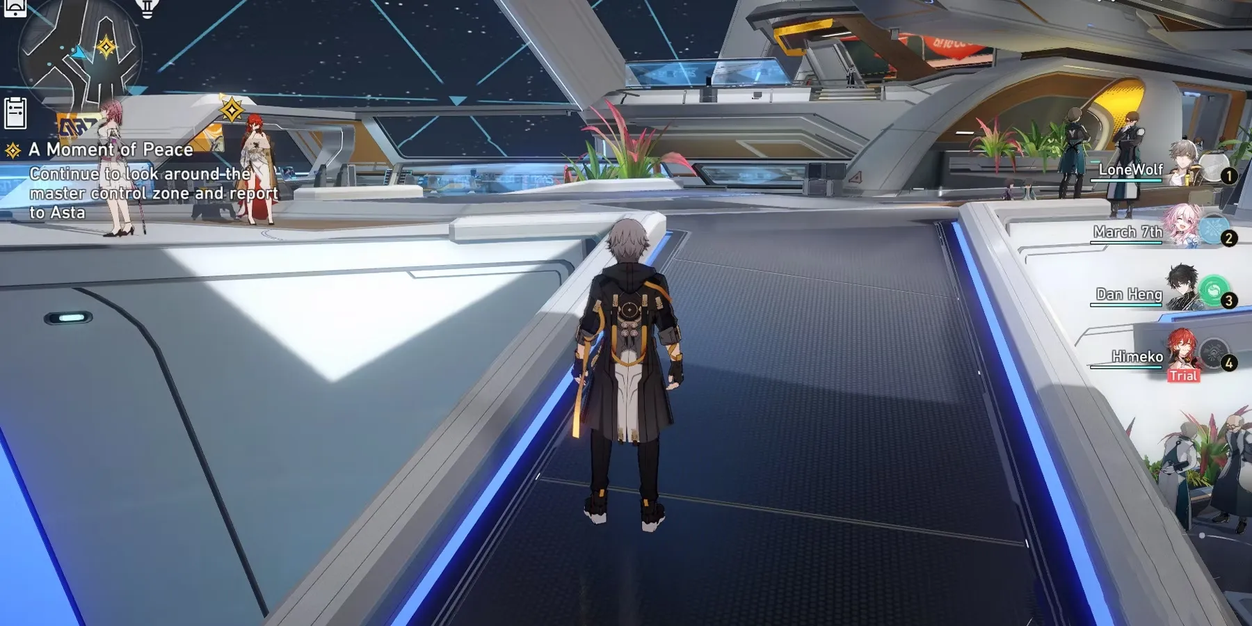 Закончив разговор с Абрахамом, Следопыт должен продолжить осмотр зоны главного контроля и доложить об этом Асте. Игроки доберутся до Асты и обнаружат Химеко, стоящую рядом с ней, а их приход вызовет кат-сцену, в которой гигантская рука взламывает щит. Аста попросит Химеко взять экспресс и уйти, но Химеко откажется и будет стоять на своем вместе с группой.