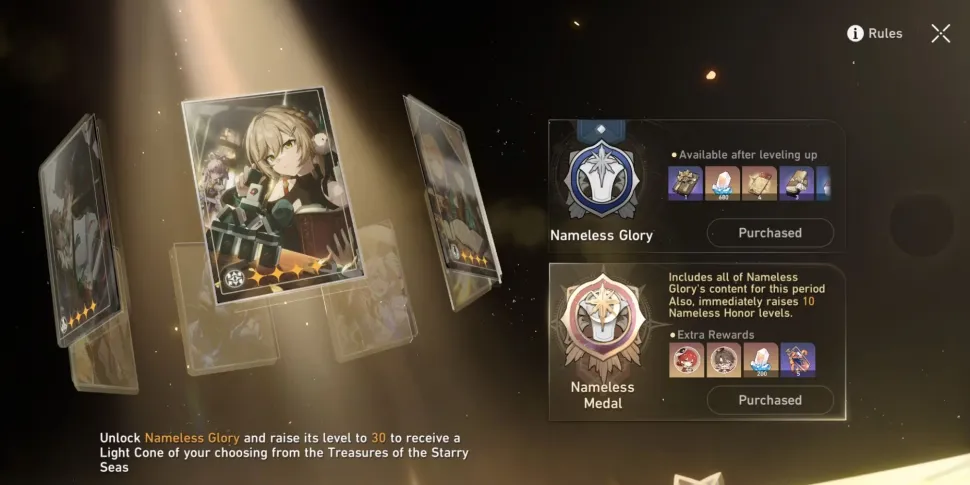 Игроки, готовые потратить реальные деньги на приобретение дополнительных ресурсов, могут выбрать покупку Nameless Glory, которая дает доступ к уникальным и эксклюзивным световым конусам. С помощью этой покупки игроки могут выкупить один из семи световых конусов по своему выбору, доступных для каждого пути на 30-м уровне. Стоит отметить, что это оружие остается неизменным в течение нескольких циклов Nameless Honor или даже навсегда, поэтому игрокам не стоит беспокоиться об упущенном, если они решили не покупать Nameless Glory.