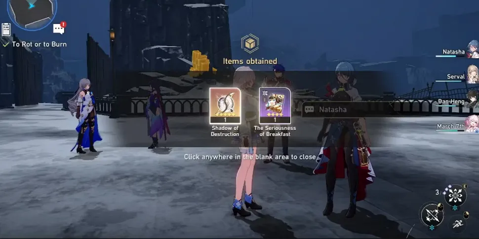 Как только игроки достигнут 18 уровня Trailblaze, они смогут продолжить выполнение главного квеста. После завершения квеста To Rot or To Burn можно получить вторую Тень разрушения, а также 4-звездочный световой конус The Seriousness of Breakfast. Это то же самое оружие, которое игроки могут получить в магазине Forgotten Hall или открыв дверь тройной аутентификации в Honkai: Star Rail.