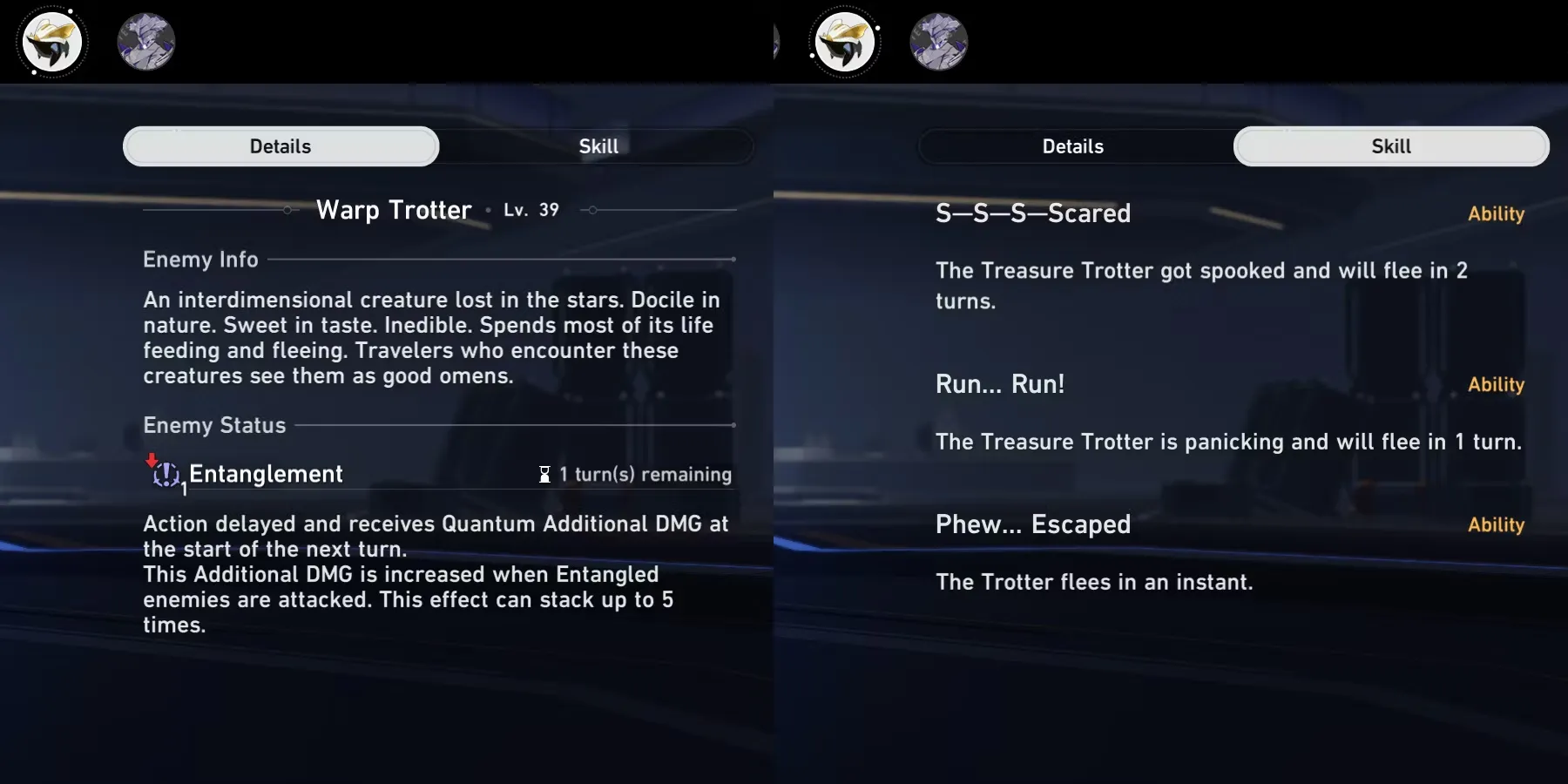 Однако победить Warp Trotter в игре Honkai: Star Rail не так-то просто, поскольку существо убежит на третьем ходу. При первом действии Warp Trotter будет напуган. На следующем ходу он приготовится к бегству и уберет все свои слабости. Наконец, на третьем ходу животное убежит, и игрокам придется повторить попытку позже, чтобы получить добычу в виде звездного нефрита.