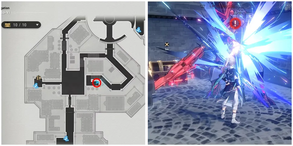 Из предыдущего места продолжайте идти по северному пути, затем поверните немного на восток, чтобы открыть шестое базовое сокровище рядом с лестницей. В качестве альтернативы, если игроки достигли 30-го уровня, они могут телепортироваться в Stagnant Shadow: Shape of Fulmination в Honkai: Star Rail.