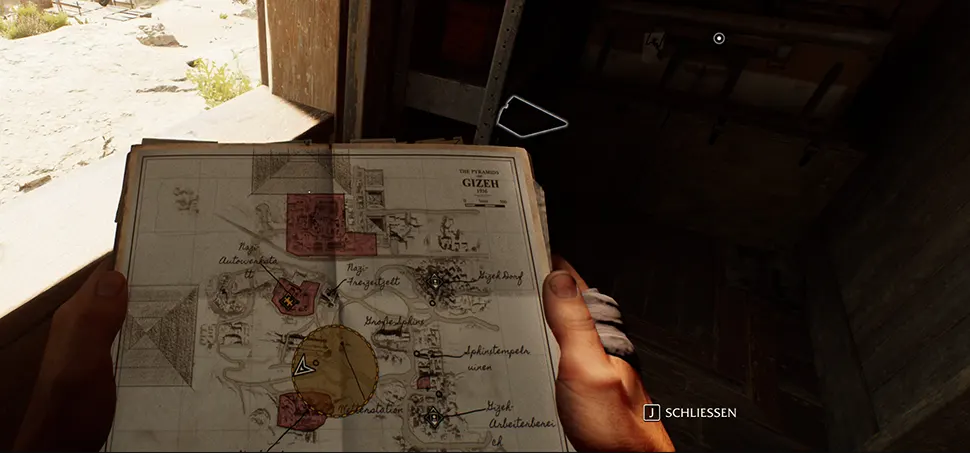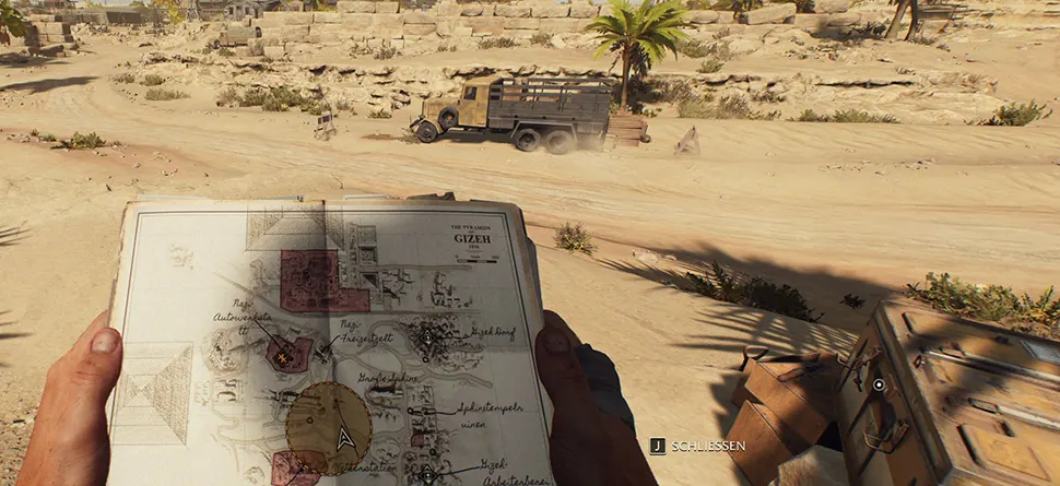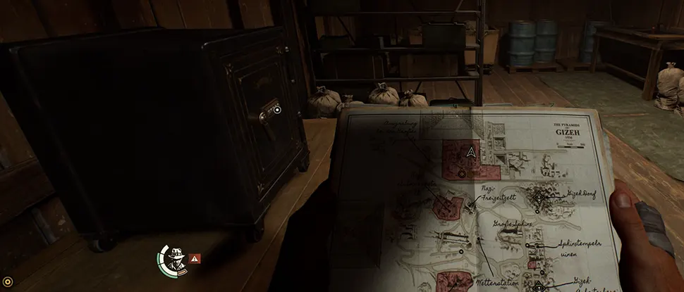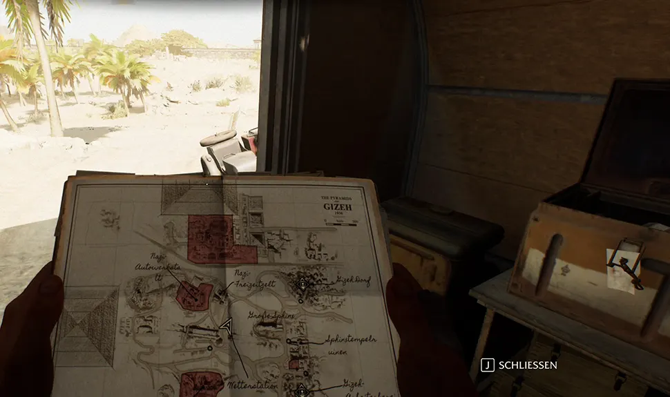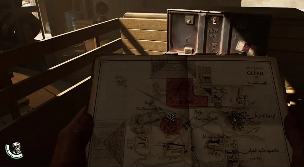 - Локация: Письмо, содержащее подсказку, находится в немецком гараже. Сундук расположен вдоль главной дороги между Большим Сфинксом и гробницей Хенткаус.
