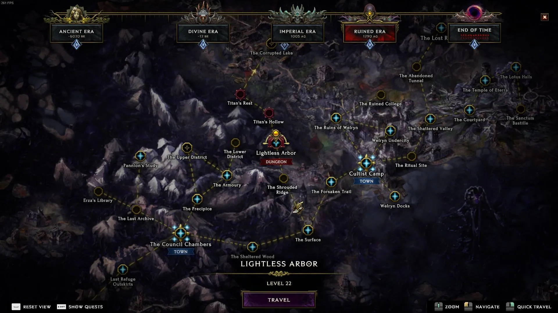 Как только вы получите 22-й или более высокий уровень, вы сможете отправиться в подземелье Lightless Arbor. Пройдите начальные этапы кампании, пока не попадете в Зал Совета в Разрушенной Эпохе. Оттуда двигайтесь к Поверхности, а затем на север к Окутанному хребту, чтобы найти Lightless Arbor. Завершение этого подземелья открывает доступ в Имперскую эпоху через Поврежденное озеро.