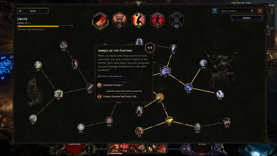 Эти пассивки увеличивают общий урон, наносимый Swipe, за счет бонусного урона, мультипликативного увеличения урона, дополнительной скорости атаки и небольшого запаса жизни. Однако для увеличения урона потребуется время, так как эта установка зависит от наличия максимальных стаков Aspect of the Panther. Для увеличения урона используйте эффекты и предметы, применяющие Ailments.