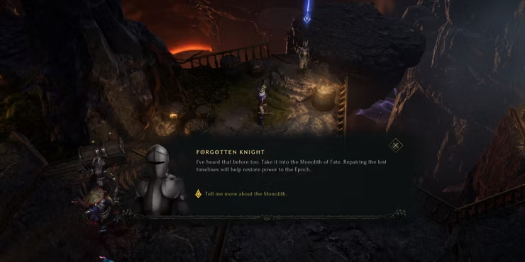 Активность "Монолит судьбы" открывается после завершения кампании Last Epoch. Когда вы дойдете до конца кампании, вы разблокируете побочный квест "Монолит судьбы", который приведет вас в Конец времен. Поговорите с Забытым рыцарем в центральном городе, и он вкратце объяснит, как работает Монолит. Когда будете готовы, отправляйтесь на восточную окраину города, чтобы получить доступ к временной шкале подземелий Монолита.