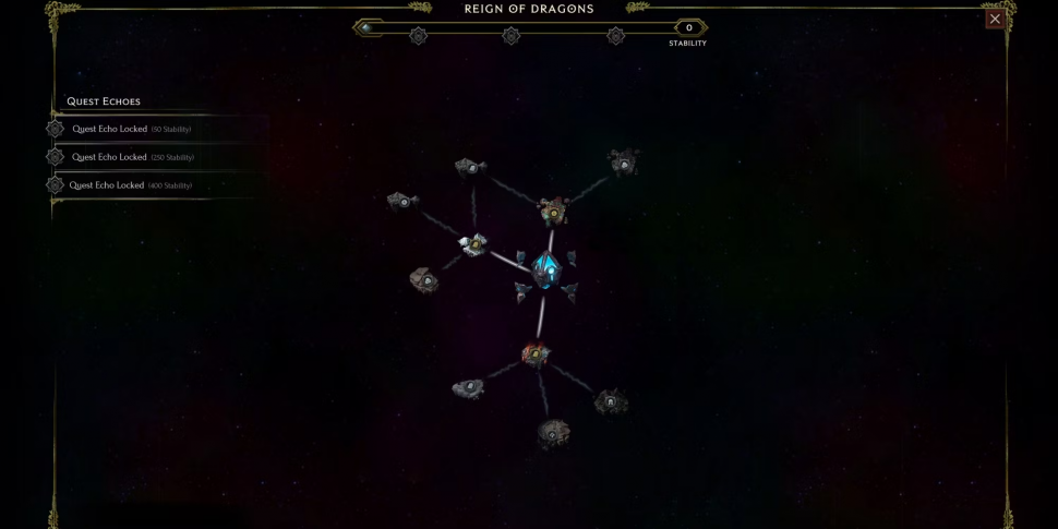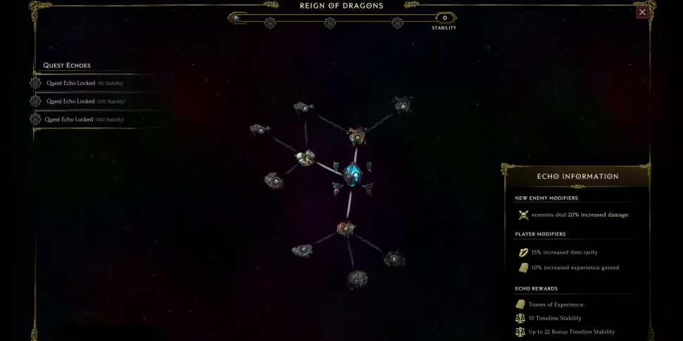 Как только вы заработаете достаточно стабильности (обычно 240-400), вы получите доступ к финальному квестовому эху этой временной шкалы. Победите босса в этом Эхо, и вы обменяете всю свою стабильность на награды, эксклюзивные для пула лута этого босса. Например, "Искривленное сердце Ухкейроса" может выпасть только с финального босса во временной шкале Reign of Dragons.